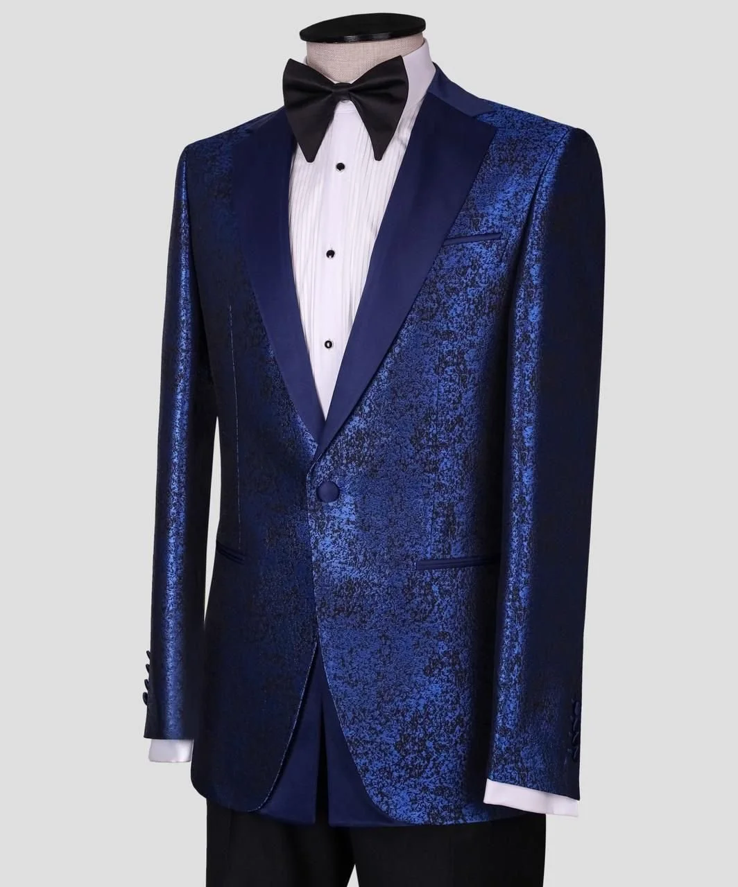 Featuring a rich textured finish with a subtle metallic sheen, this tuxedo reflects light beautifully, creating depth and a premium visual appeal. The smooth satin shawl lapel adds a refined contrast, delivering a sharp, polished look perfect for high-end occasions.