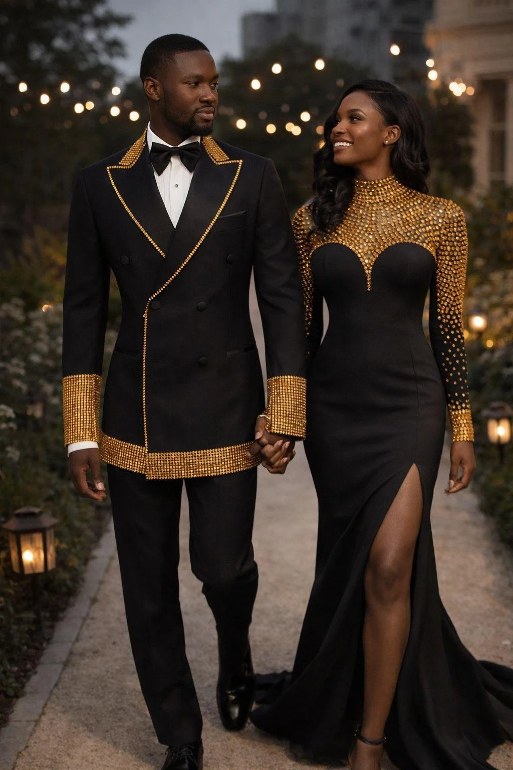 Unleash pure dominance in the Imperial Noir Gold Crystal Double-Breasted Tuxedo—a bold expression of power, prestige, and unmatched luxury.