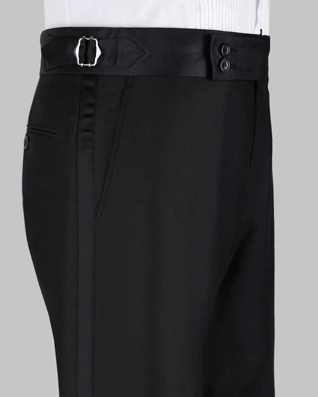 Slim-fit trousers with satin side stripe and adjustable side tabs.