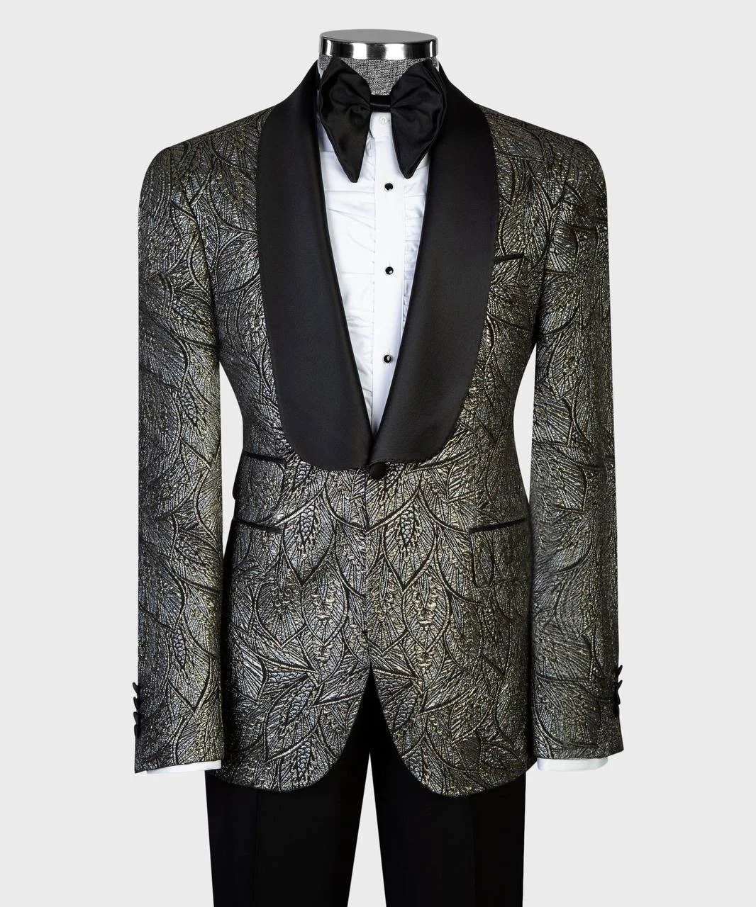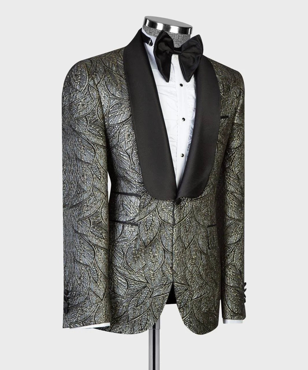 Daring. Distinct. Definitive. The Leaf-Pattern Textured Tuxedo Set captures the essence of luxury eveningwear with its intricate gold and black leaf embroidery and opulent satin shawl lapel. Crafted from a premium fabric blend, it radiates a refined sheen that embodies sophistication and bold character. Designed for the gentleman who commands attention, this tuxedo stands as a statement of pure confidence and timeless style.
