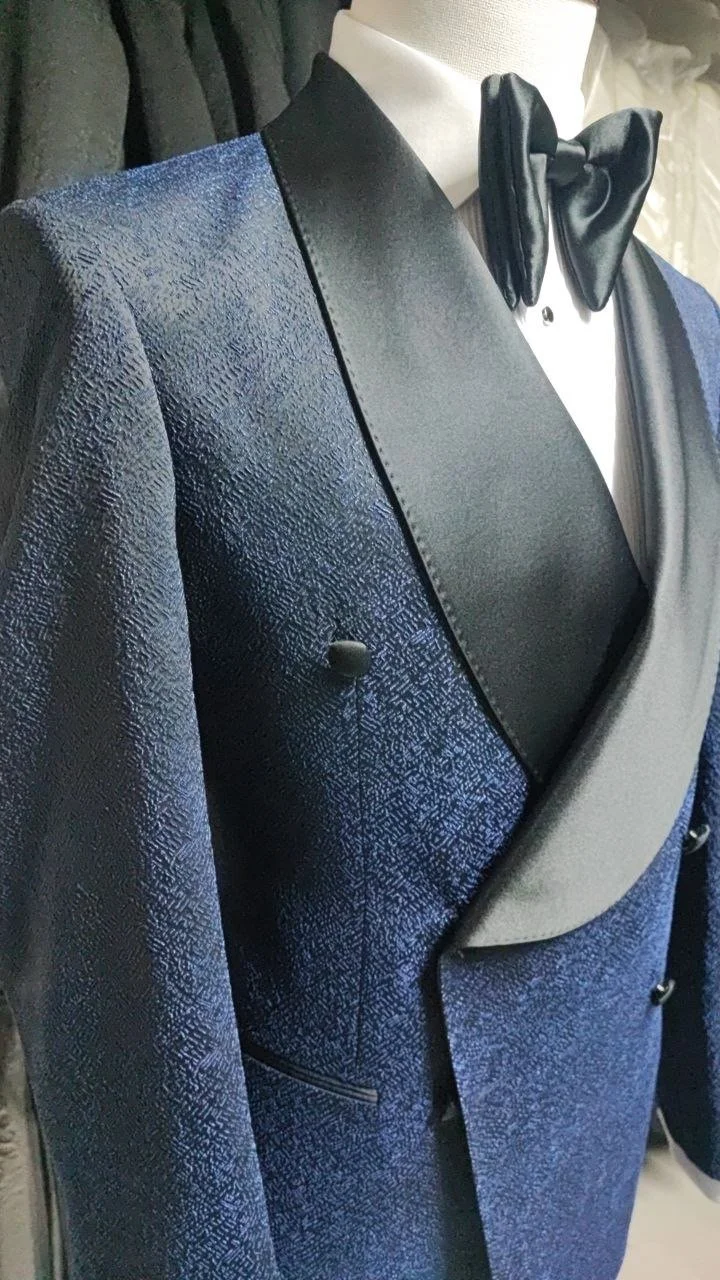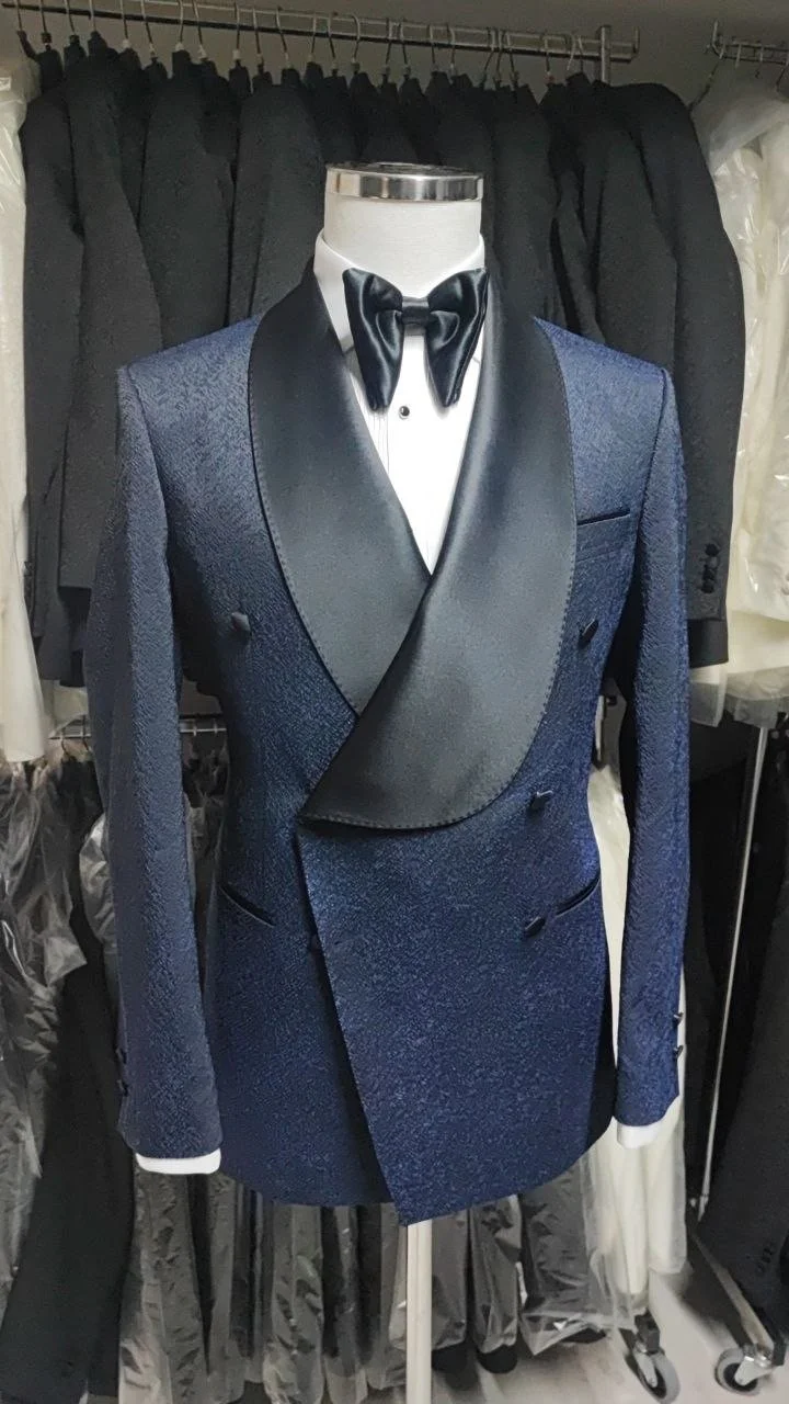 Introducing the Midnight Regent Textured Tuxedo Set, crafted for the modern gentleman who commands attention with effortless elegance. This double-breasted tuxedo features a rich midnight-blue textured fabric, paired with a luxurious black satin peak lapel that elevates the entire silhouette. Perfect for grooms, galas, red-carpet moments, and high-end formal events.