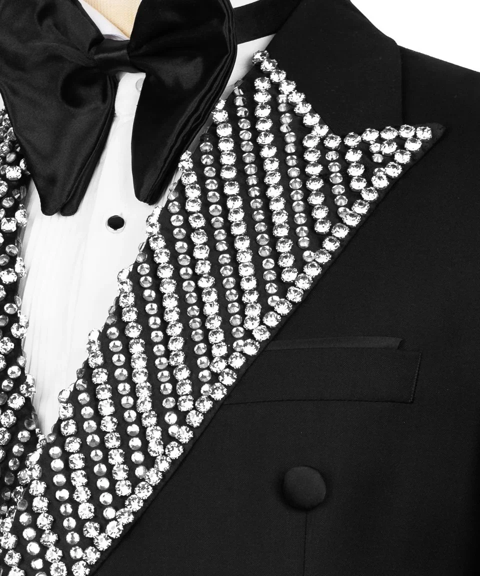 Command attention with the Crystal Regent Embellished Tuxedo Set, an iconic masterpiece from Noble Fit that redefines sophistication and masculine elegance. Handcrafted with precision, this double-breasted tuxedo showcases a luxurious rhinestone-encrusted peak lapel that glimmers under any light — perfect for red-carpet moments, weddings, or grand celebrations.