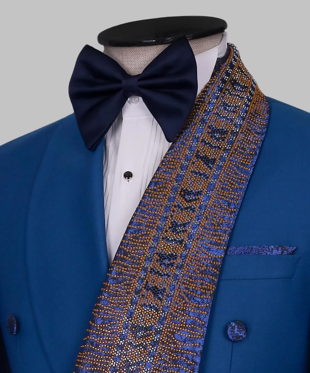 The Royal Sapphire Double-Breasted Tuxedo is a bold expression of elegance and prestige. Designed for the modern gentleman who appreciates refined craftsmanship, this Noble Fit piece combines timeless tailoring with artistic luxury detailing.
