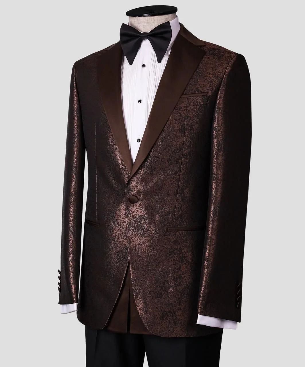 Understated power with a luxurious edge. The Regent Single-Breasted Tuxedo is crafted for the modern gentleman who appreciates refined detail and bold elegance. Featuring a rich bronze-burgundy textured finish, this tuxedo delivers a unique metallic depth that elevates any formal look.