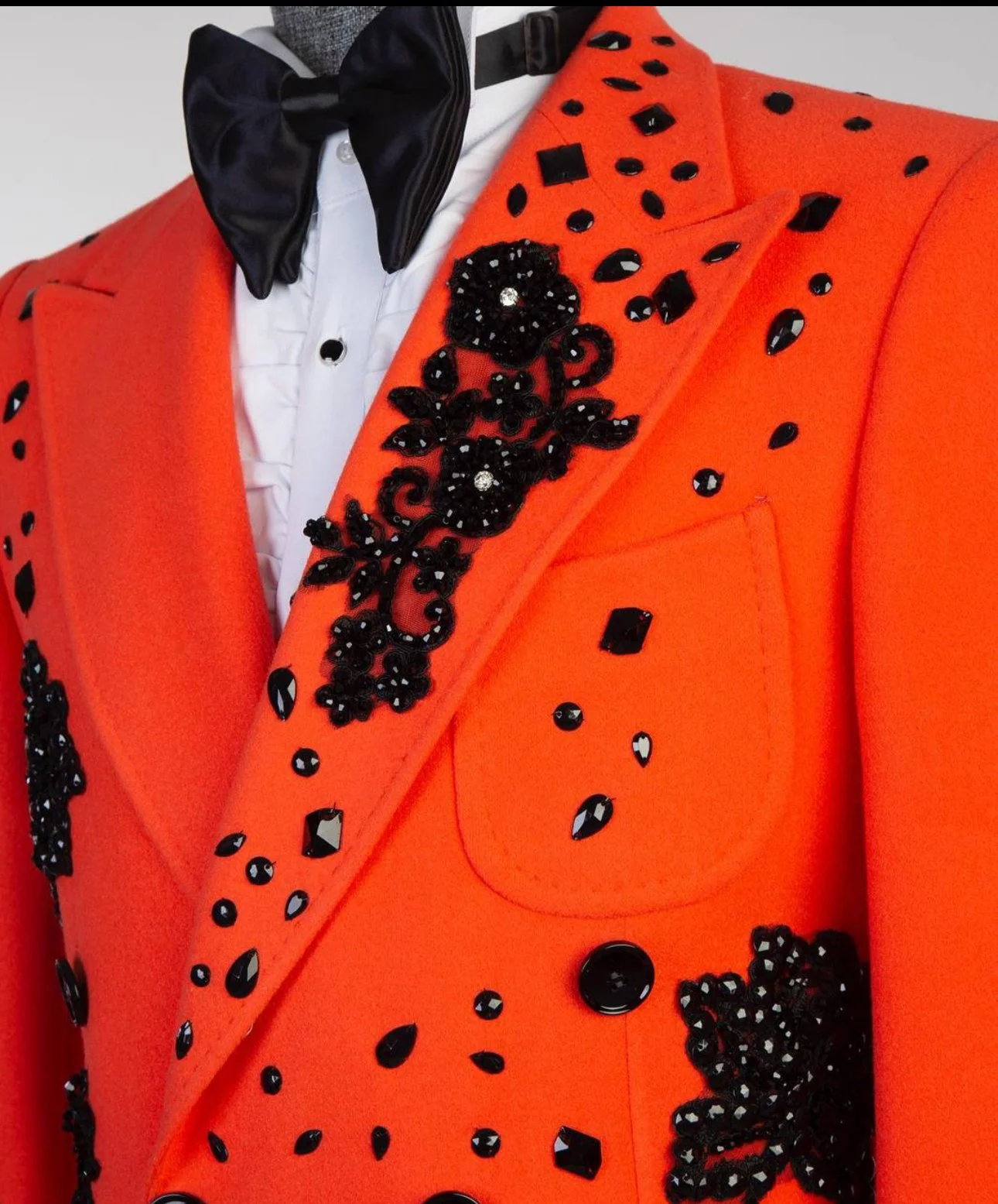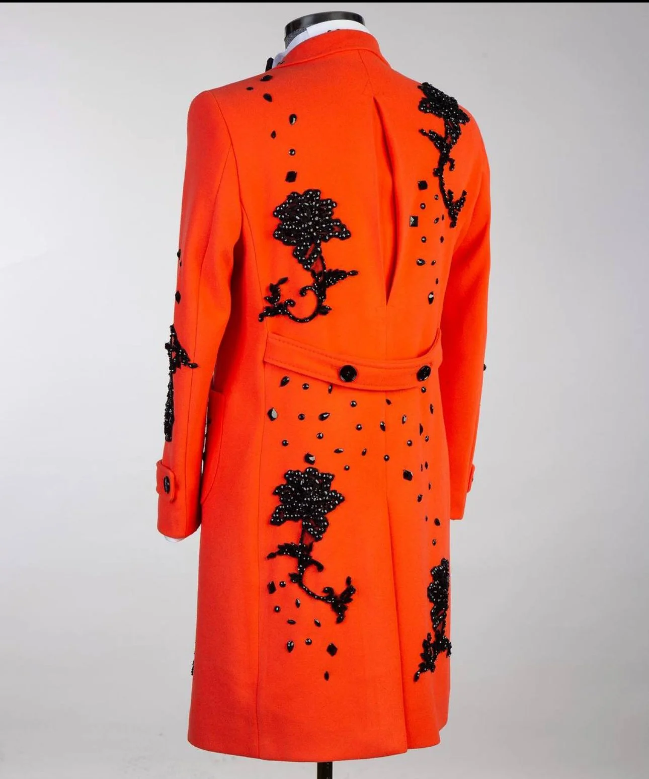 Unleash your commanding presence with the Crimson Monarch Embellished Overcoat — a statement of power, precision, and poise. Crafted in a rich crimson hue, this masterpiece merges classic tailoring with bold artistry. Hand-applied black beadwork and crystal embellishments form intricate floral patterns that cascade across the coat, creating a breathtaking visual of depth and elegance.