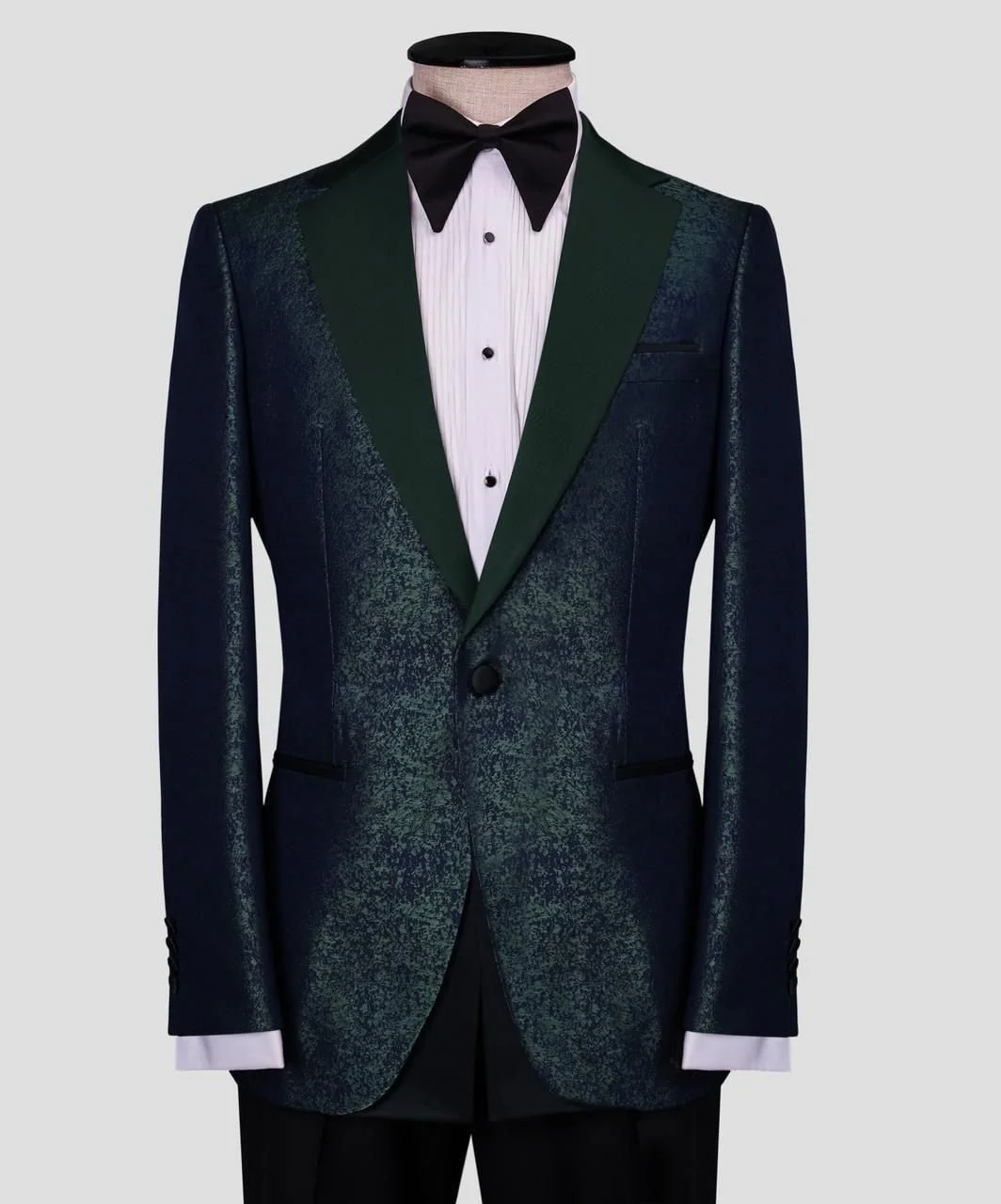 Crafted with a rich textured finish that subtly reflects light, this piece blends dark navy and emerald hues for a unique, elevated look. The smooth satin shawl lapel enhances the contrast, delivering a sharp and polished silhouette perfect for high-end occasions.