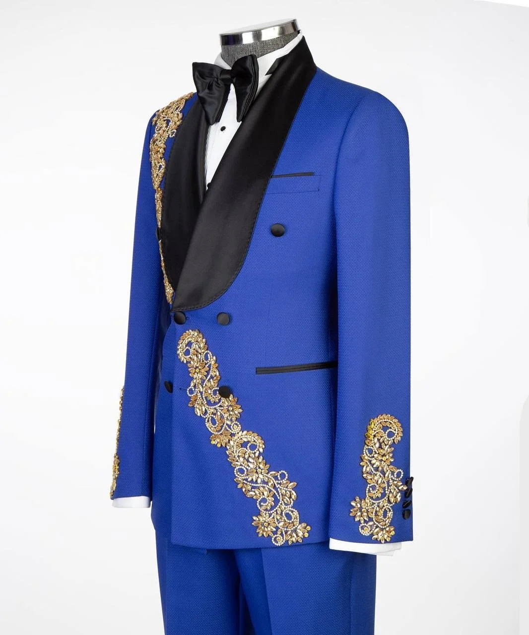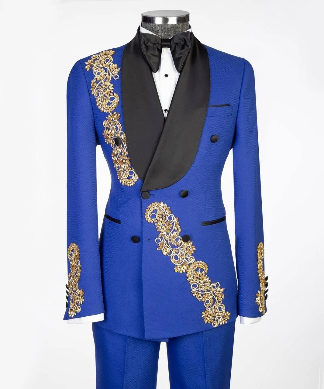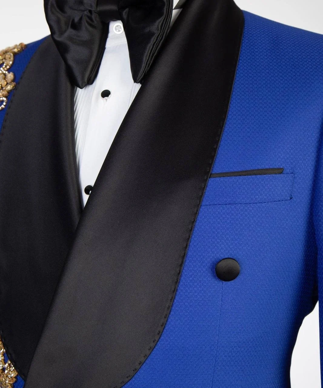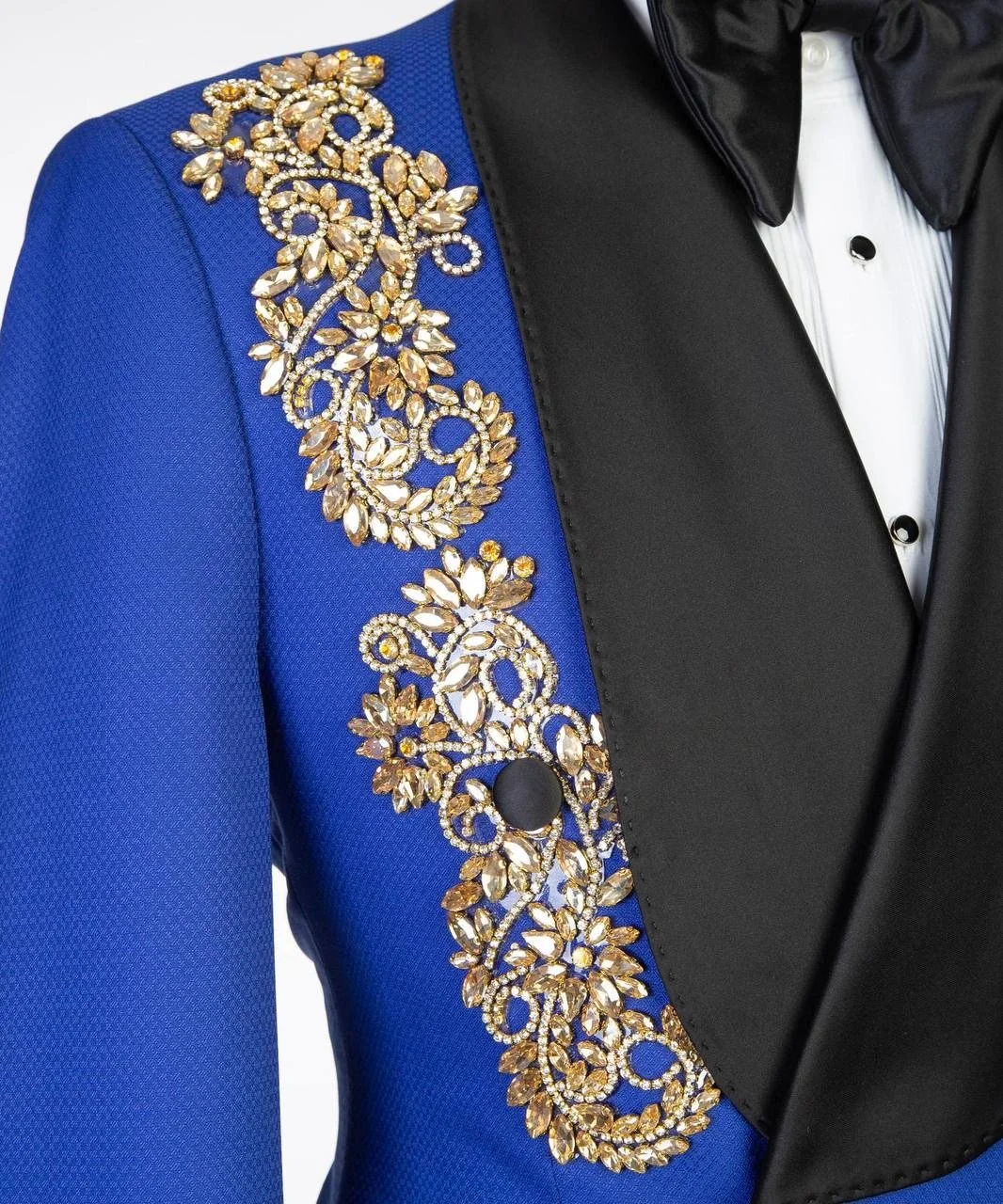 Royal blue base with gold crystal embellishments and black satin shawl lapel