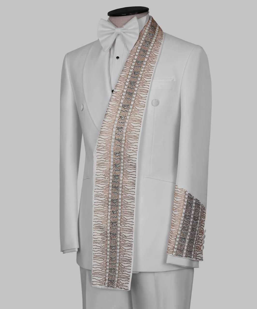 The jacket is a clean ivory white tone, while the decorative ceremonial panel features gold and silver crystal-style embellishments that create the luxury pattern across the front and sleeve accent.
