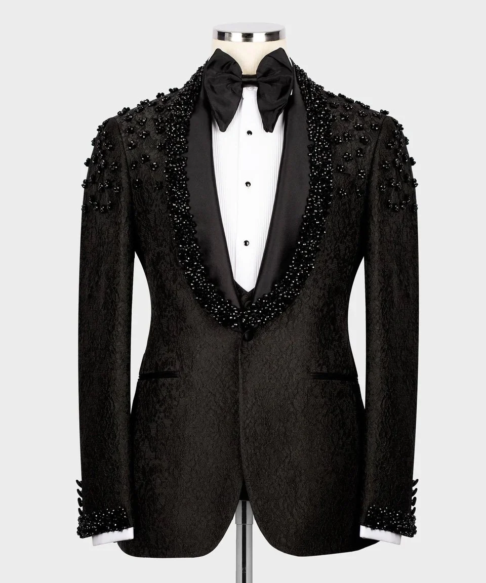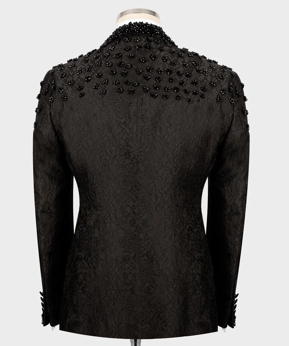 Unveil the power of refined luxury with the Royal Ember Embellished Tuxedo Set — a breathtaking fusion of bold craftsmanship and timeless design. This exquisite black jacquard tuxedo is meticulously adorned with hand-applied golden beads, radiating warmth, confidence, and royal sophistication. Every detail reflects the artistry and excellence that define Noble Fit.