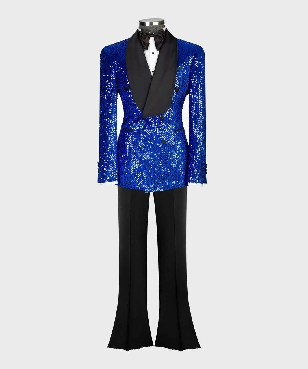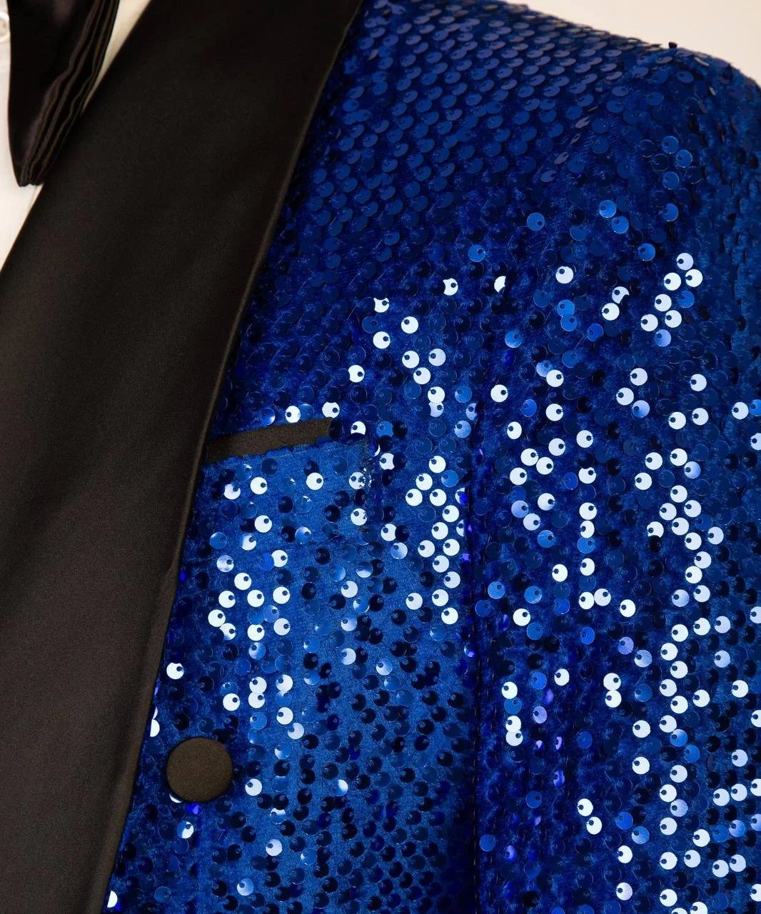 Step into bold elegance with the Royal Sapphire Tuxedo, a striking fusion of vibrant color and timeless sophistication. Crafted in a deep sapphire blue sequin finish, this double-breasted blazer captures light from every angle, while the black satin shawl lapel adds a sharp, refined contrast.