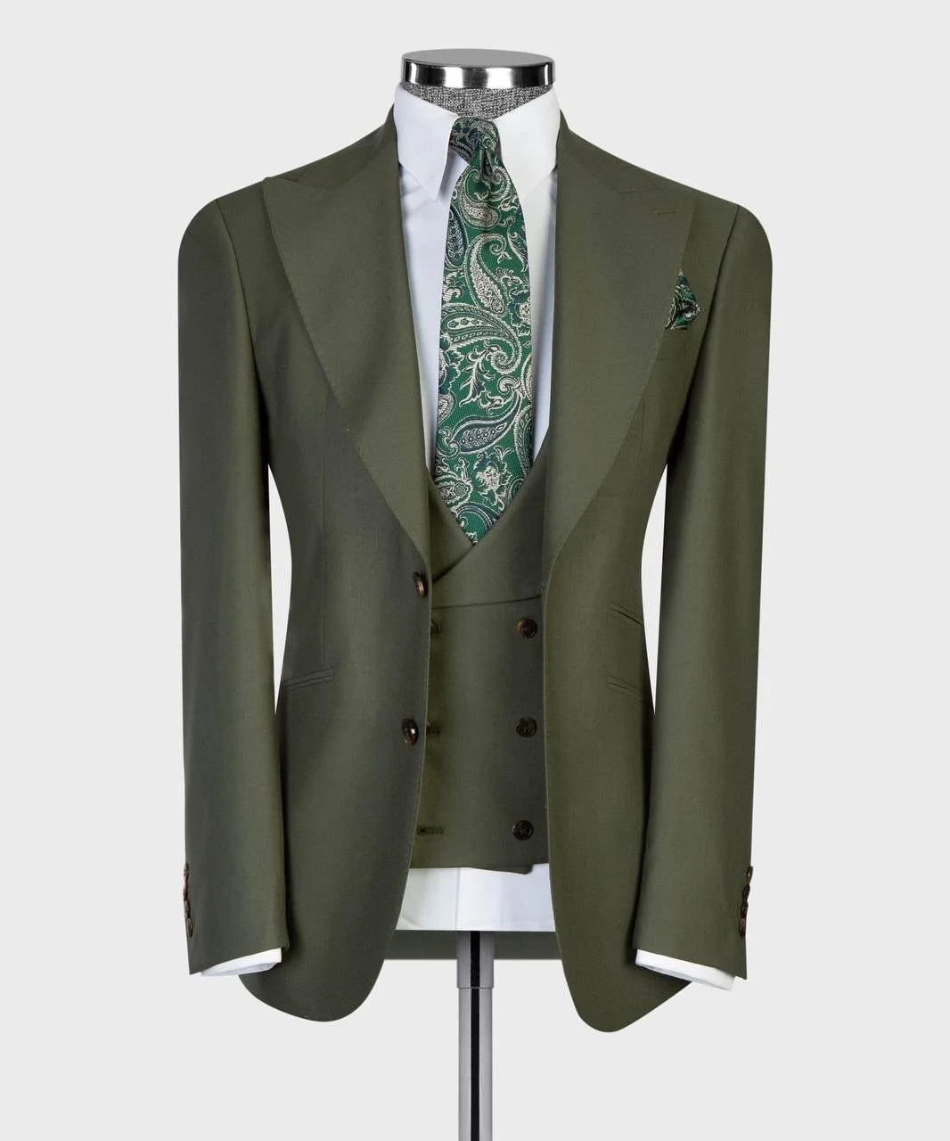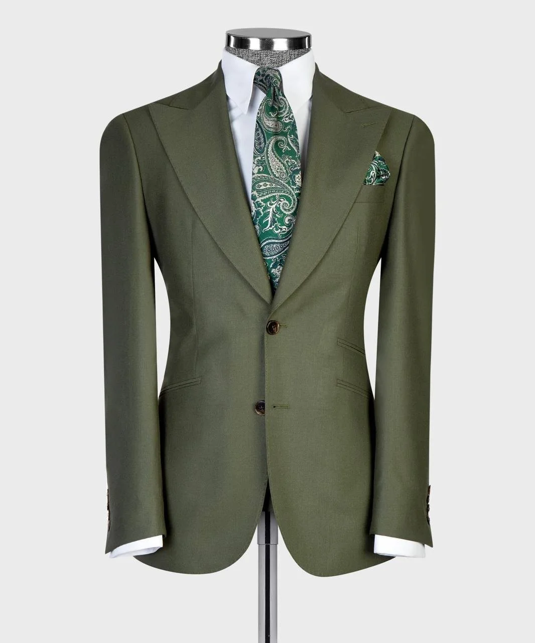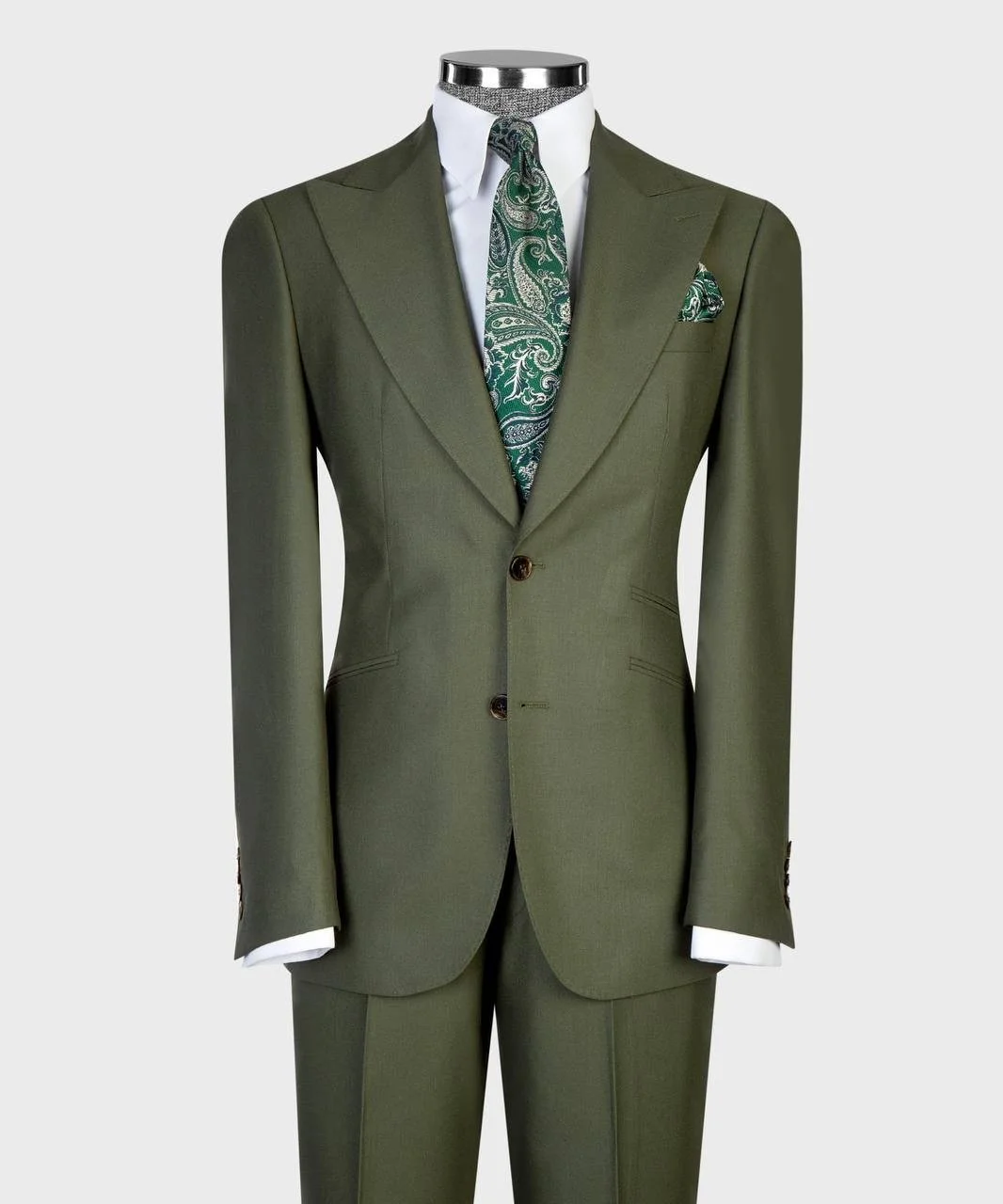 Crafted from a refined premium wool-blend fabric with a smooth, clean finish and structured drape. The deep olive green tone delivers a bold yet grounded presence — inspired by nature, strength, and timeless masculine elegance.