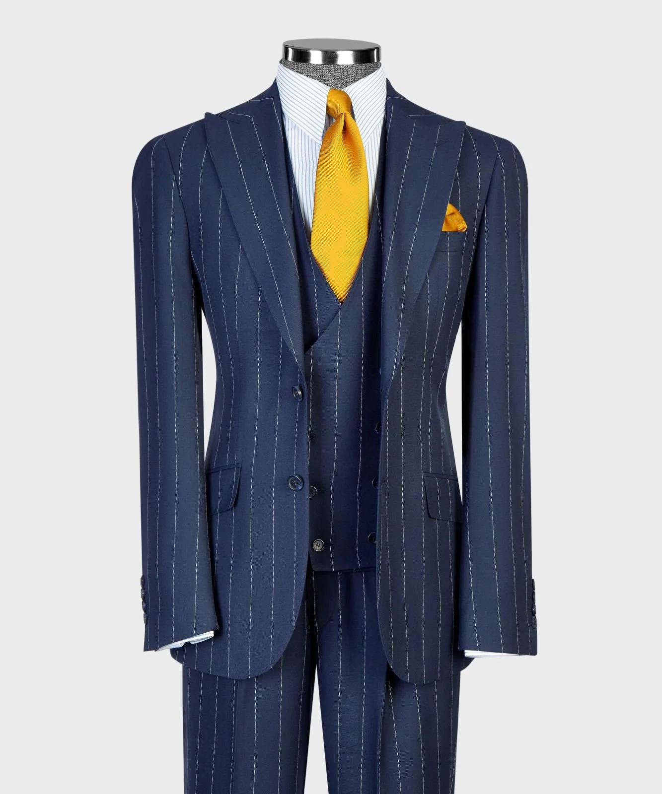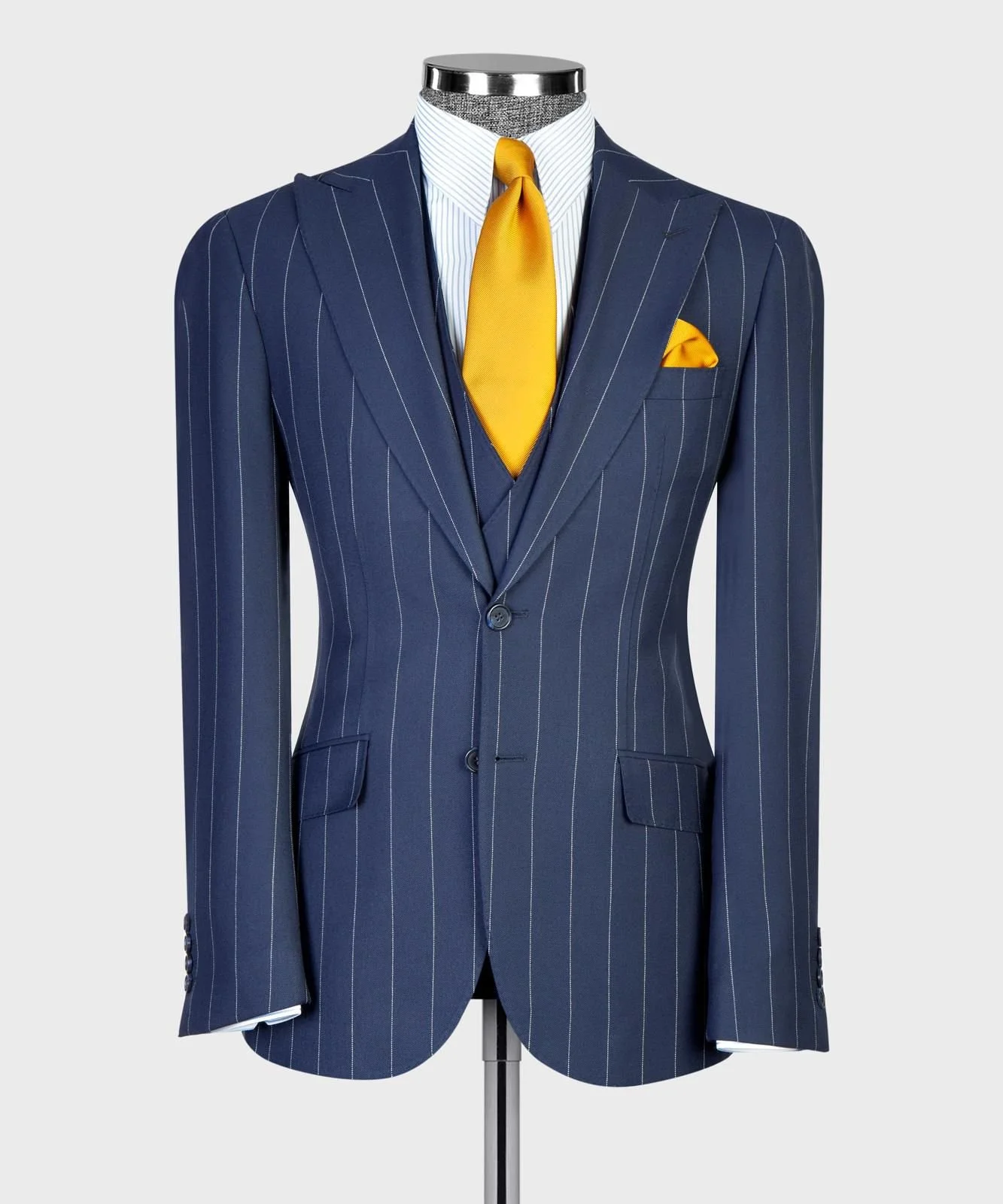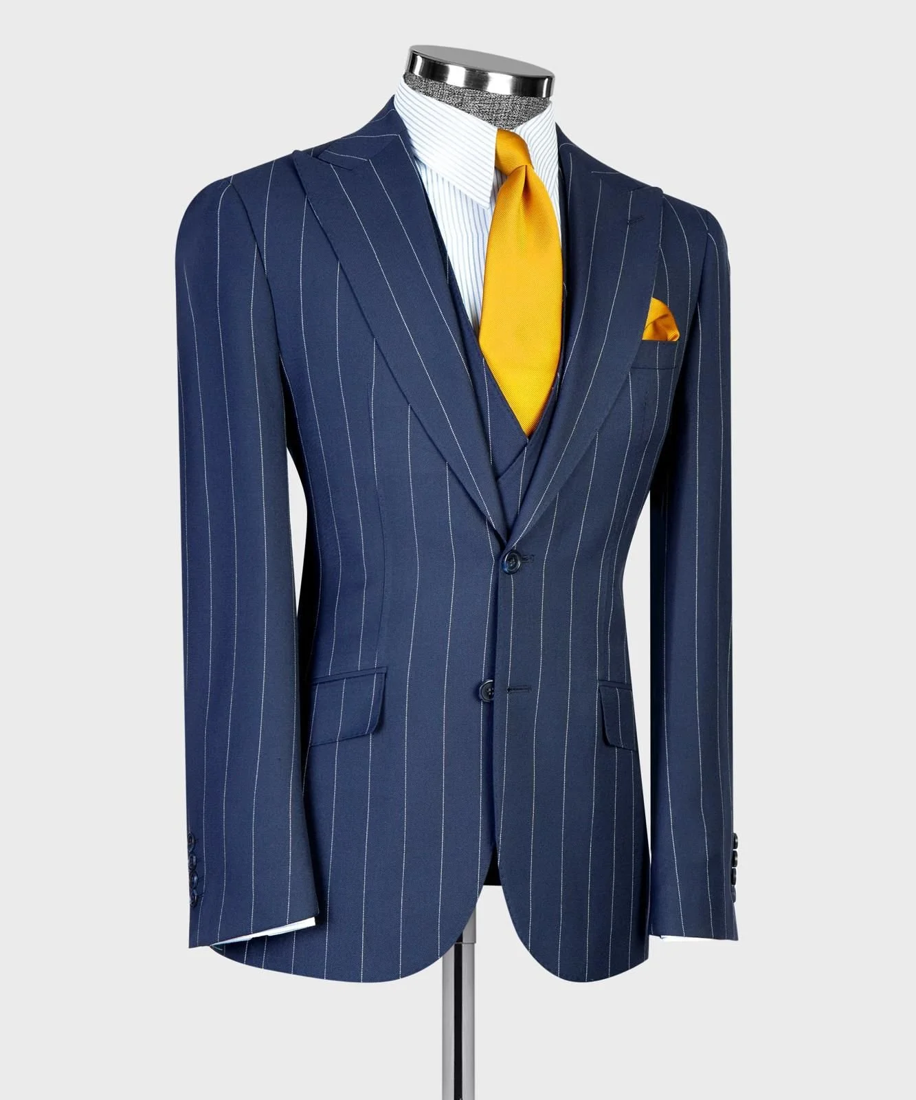 Deep navy blue with fine white pinstripes (Classic vertical stripe pattern)