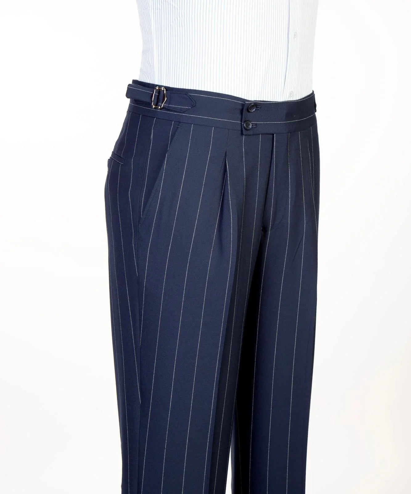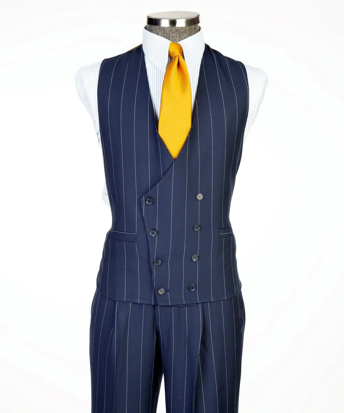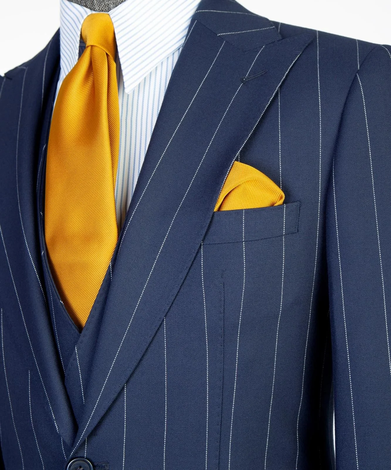 Deep navy blue with fine white pinstripes (Classic vertical stripe pattern)