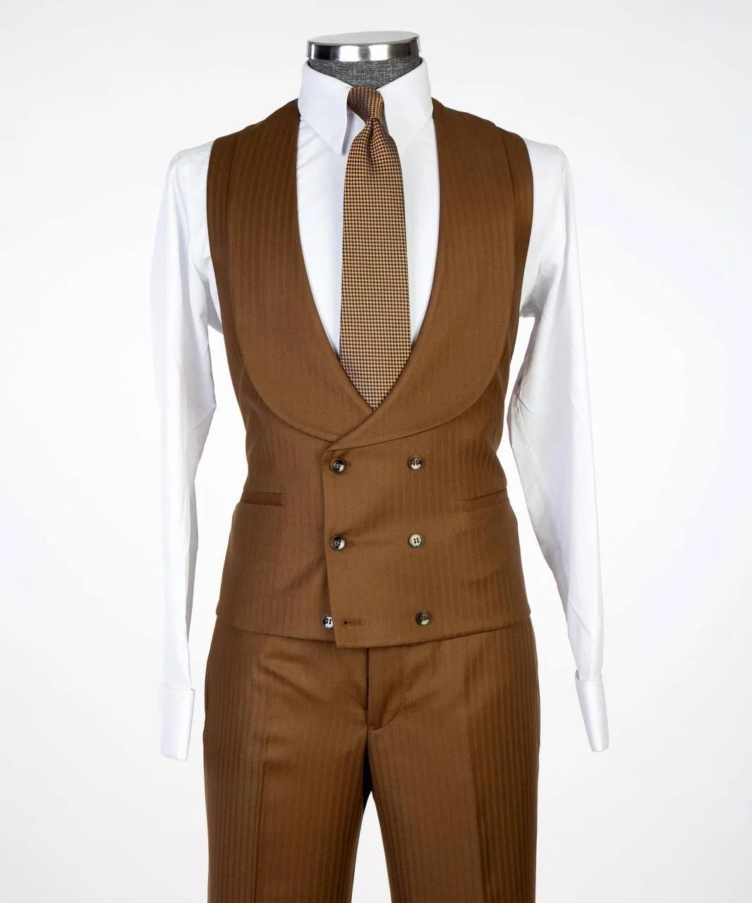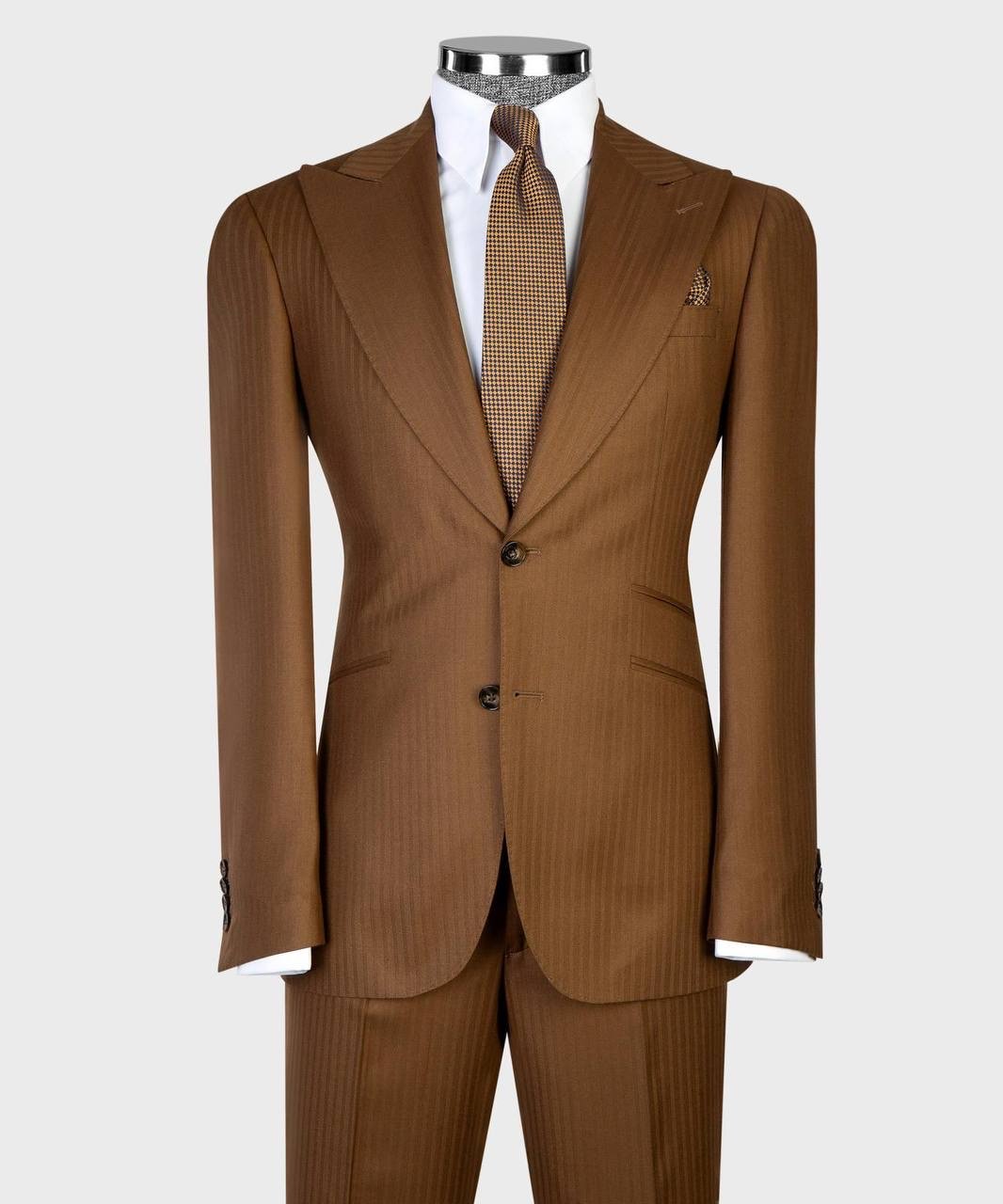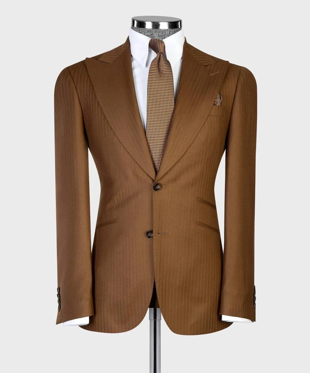 Crafted from a premium wool-blend fabric, this suit features a refined micro-pinstripe weave that adds depth and quiet sophistication. The burnt caramel tone delivers warmth, strength, and timeless masculine elegance — perfect for the modern gentleman who commands presence without saying a word.
