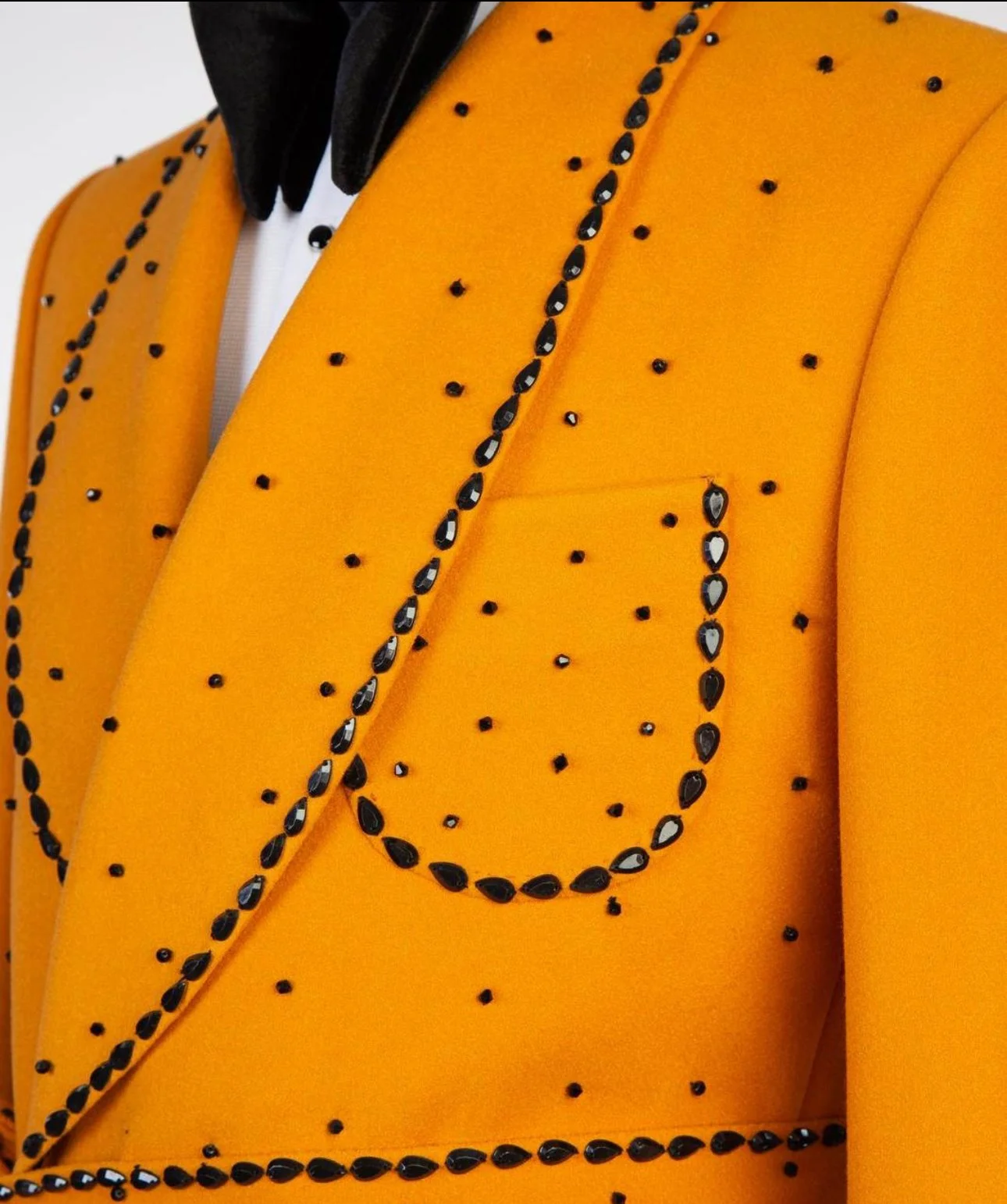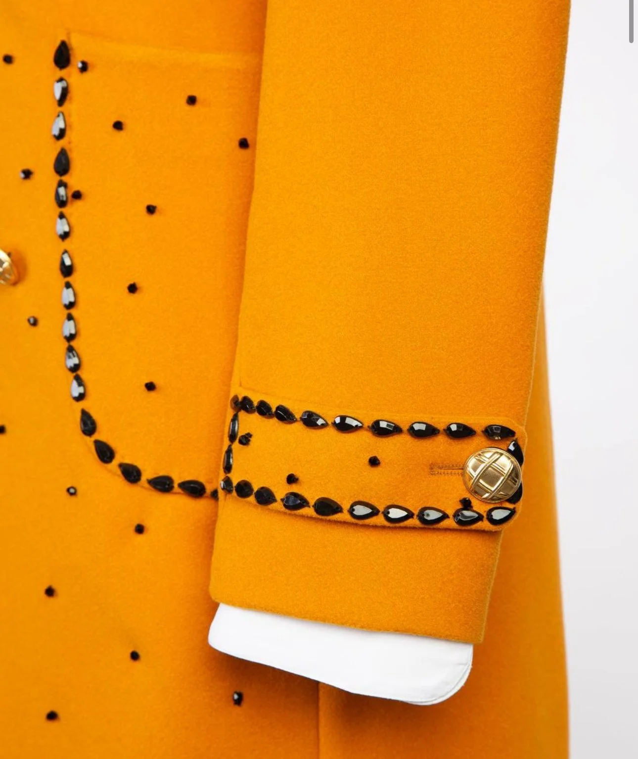 Step into distinction with the Amber Royale Embellished Overcoat, a masterpiece of power, confidence, and craftsmanship. Hand-tailored in radiant amber-orange wool, this statement piece is adorned with precisely placed black gemstone detailing that traces elegant lines along the lapels, cuffs, and belt — creating a regal interplay of texture and sophistication.