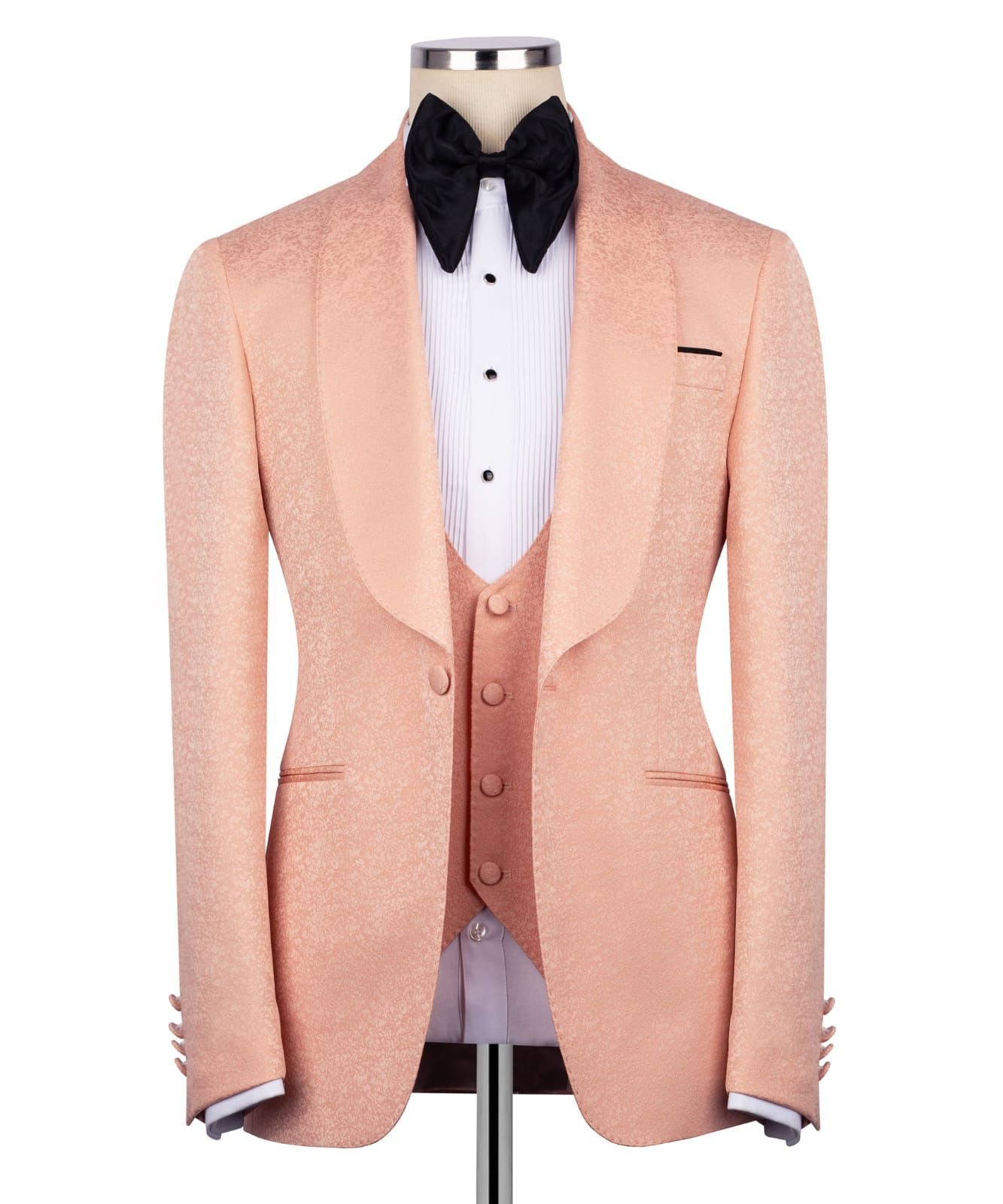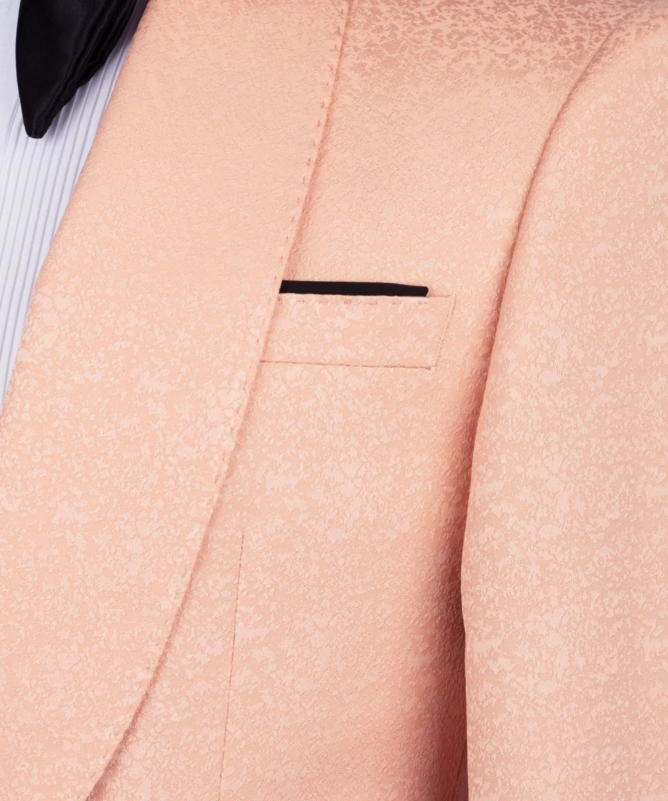 Elevate your presence with the Peach Blush Textured Tuxedo Set — a refined masterpiece tailored for the man who commands attention with subtle sophistication. Crafted from a premium jacquard blend of 60% polyester, 30% viscose, and 10% silk, this tuxedo boasts a soft sheen and intricate texture that radiates pure elegance.