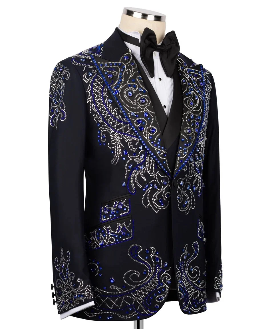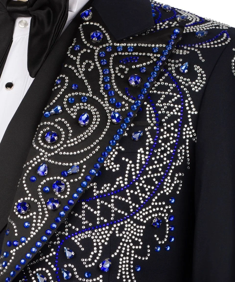 Step into pure distinction with this breathtaking tuxedo, designed for men who command attention without saying a word. The deep midnight black base is elevated with intricate sapphire-blue and silver crystal embellishments, forming a bold, regal pattern that reflects elegance and power.