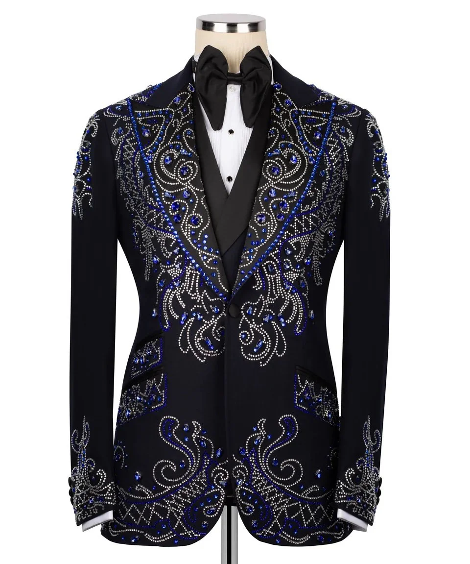 Crafted with precision and finished with a sleek satin shawl lapel, this piece blends timeless sophistication with modern luxury. Every detail—from the hand-placed crystals to the tailored silhouette—creates a statement look perfect for galas, weddings, and elite occasions.