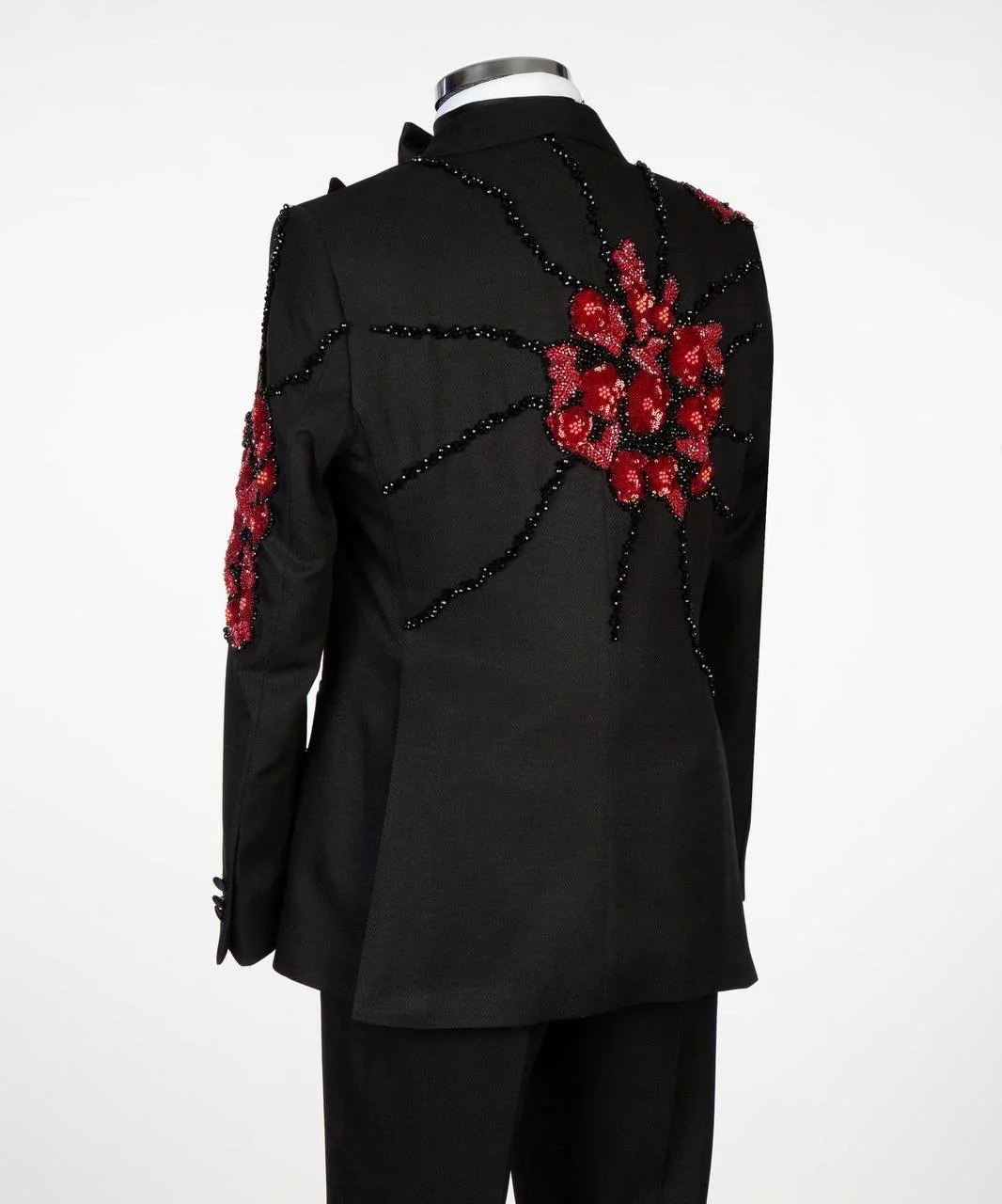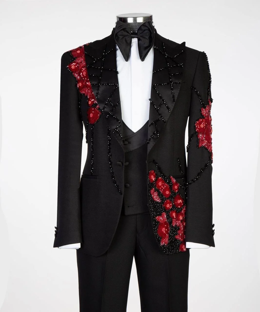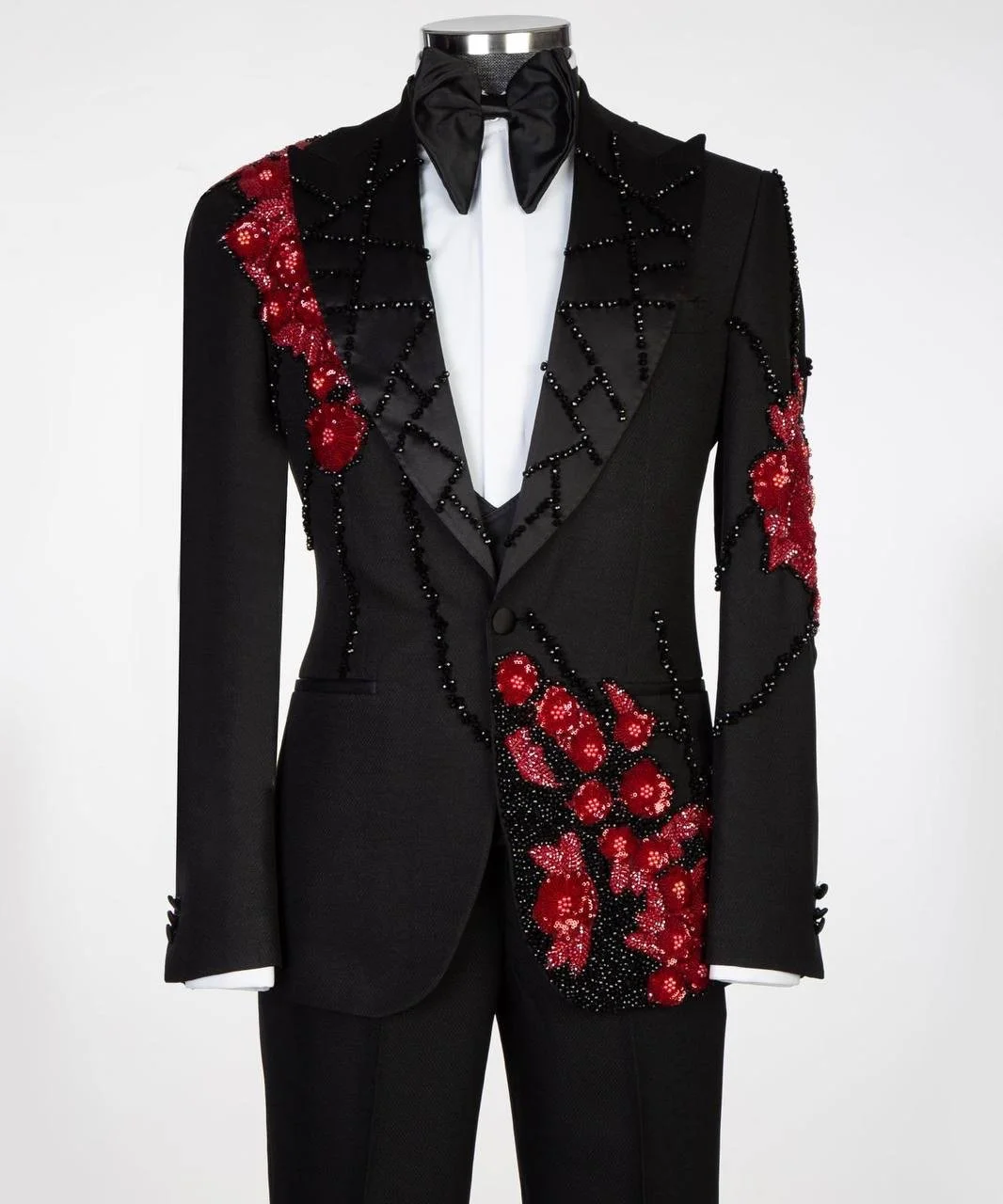 The Midnight Crimson Royale is a bold expression of masculine elegance. Crafted on a deep black luxury base, this masterpiece is elevated with hand-embellished black beadwork and striking crimson floral embroidery that flows across the shoulder, lapel, sleeve, and back in a dramatic couture pattern.