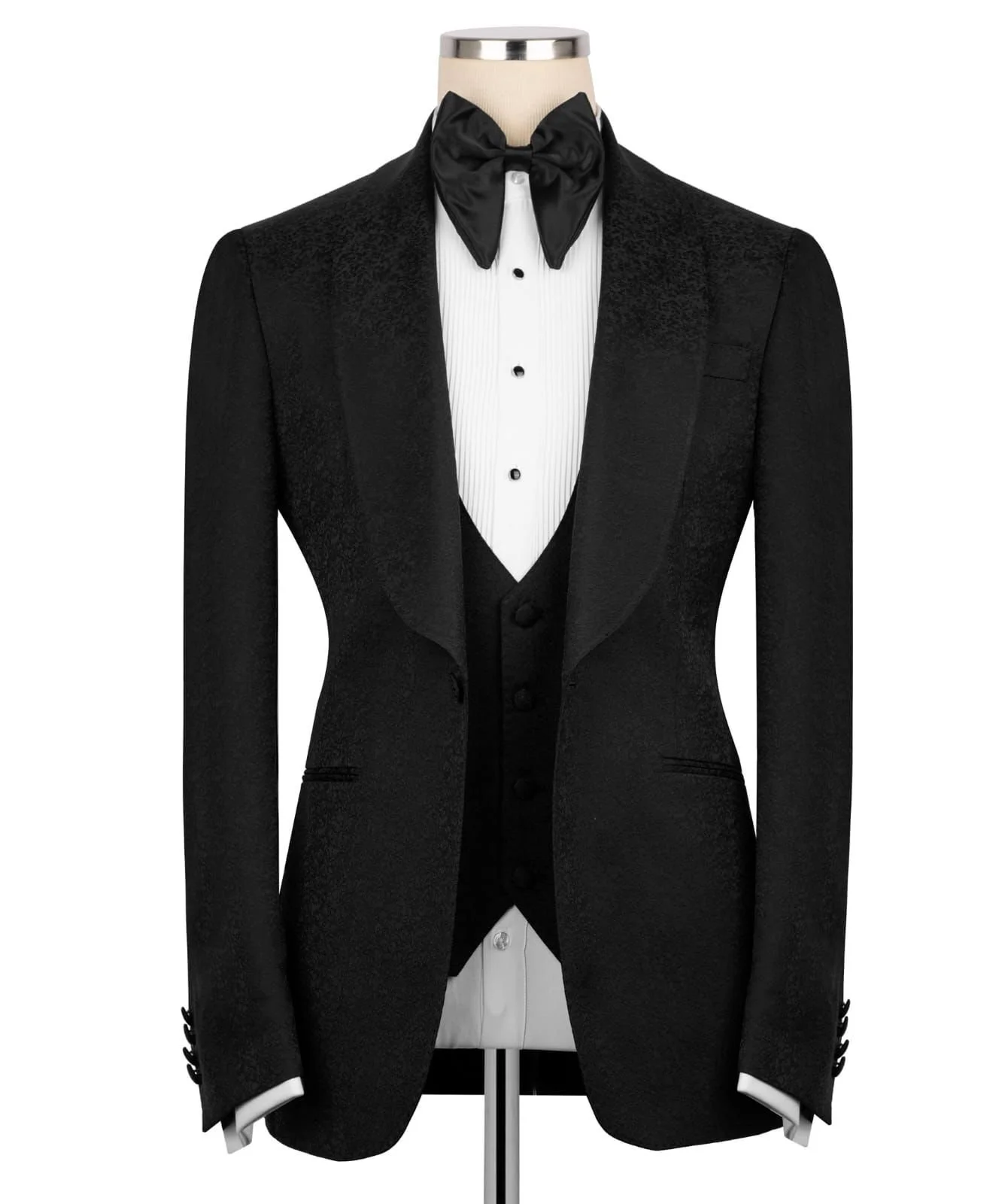Embody timeless power and sophistication with the Regal Noir Textured Tuxedo Set — the ultimate symbol of modern elegance and classic refinement. Crafted from a premium jacquard blend of 60% polyester, 30% viscose, and 10% silk, this tuxedo offers a subtle textured sheen that elevates the traditional black suit to a new standard of luxury.