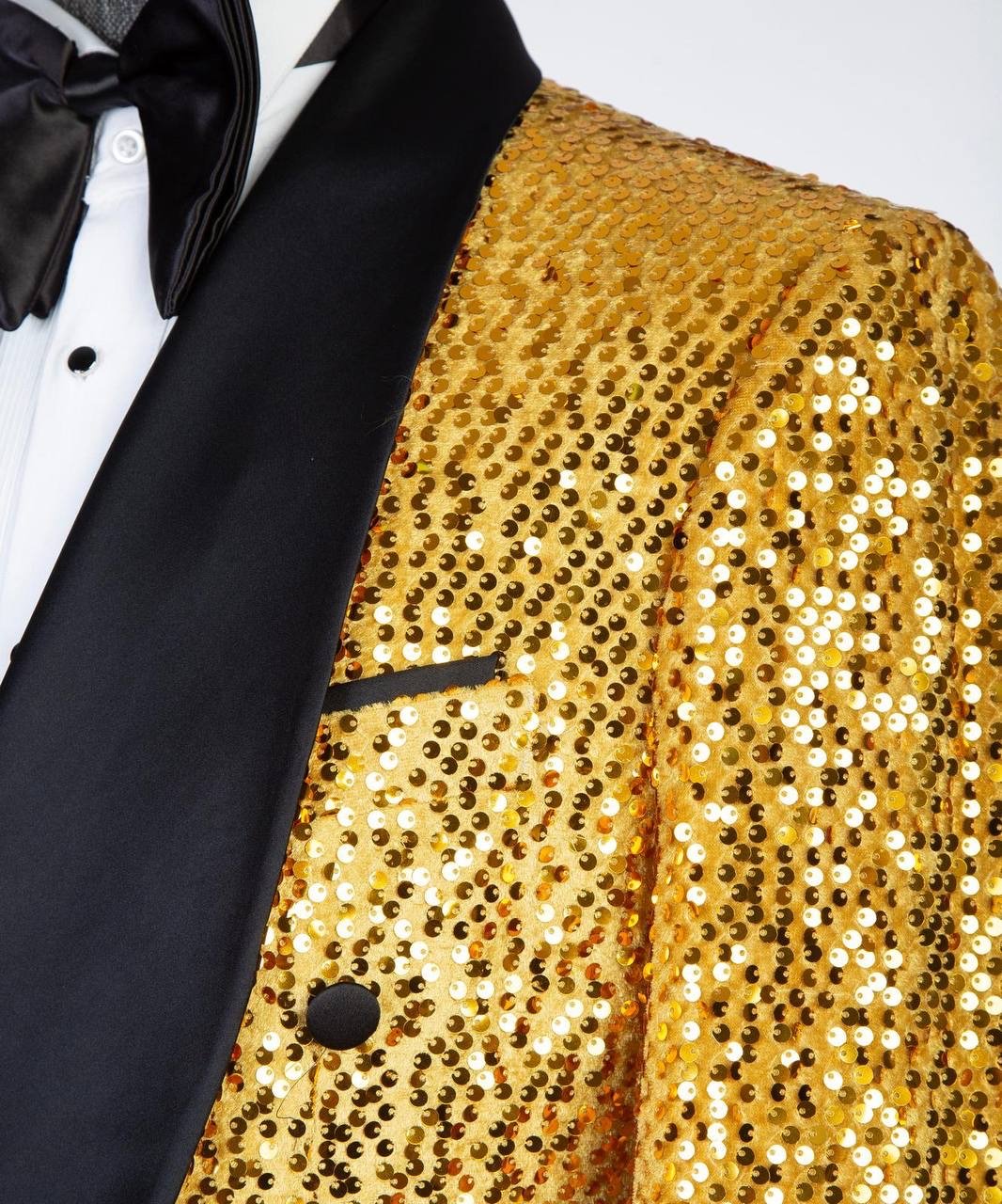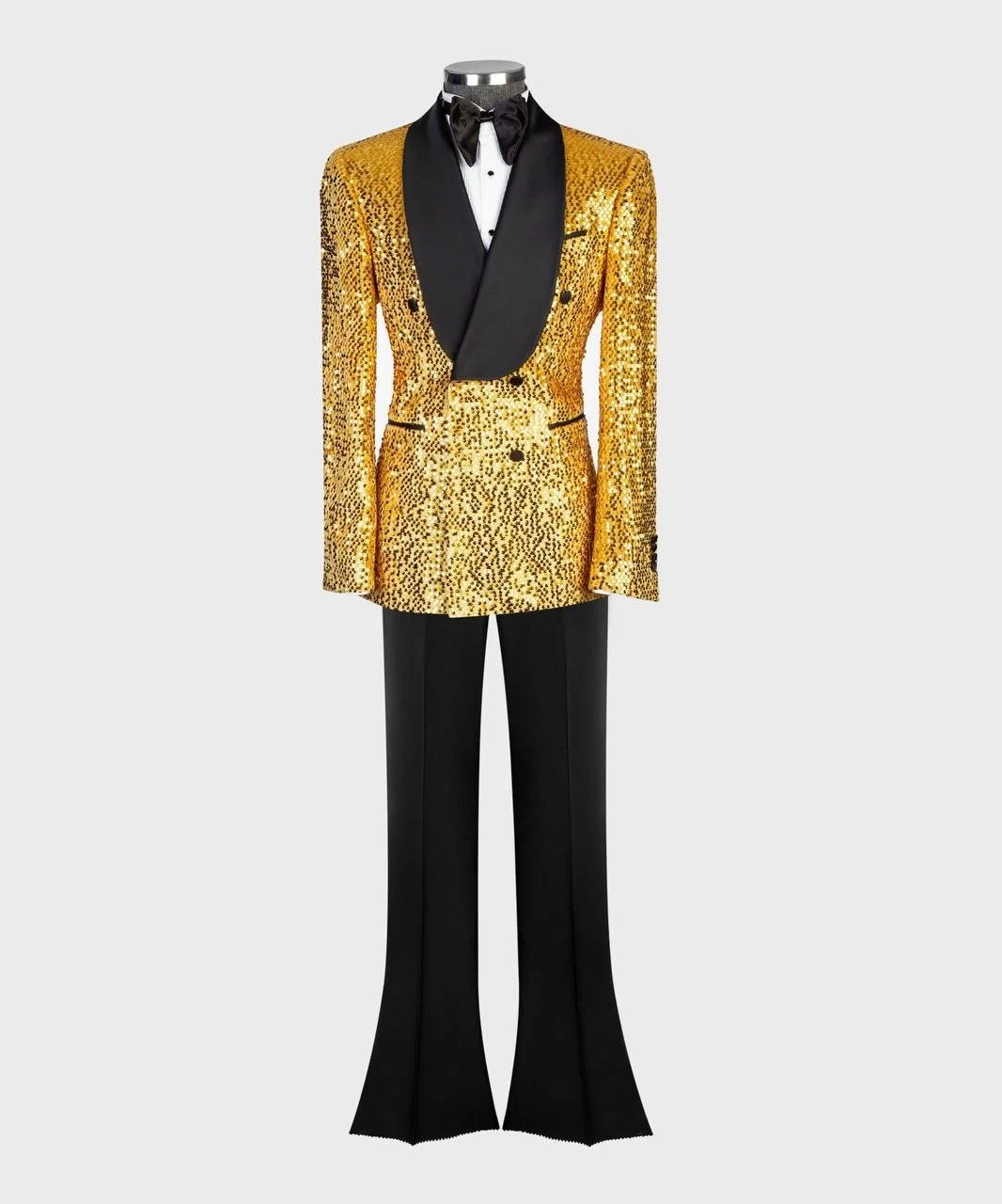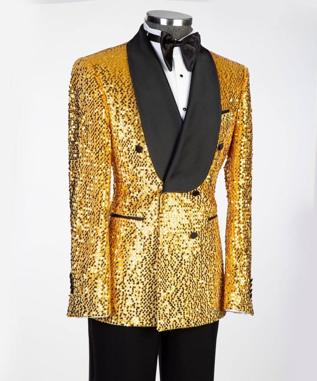 Command attention with the Imperial Gold Tuxedo, a bold expression of luxury and power. Designed in radiant gold sequin fabric, this piece reflects prestige from every angle, while the deep black satin shawl lapel delivers a sharp, elegant contrast.
