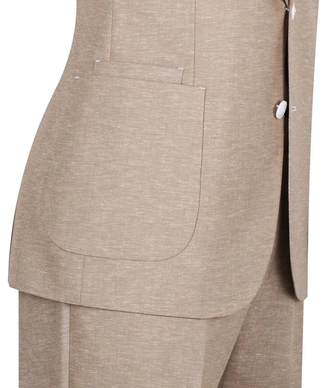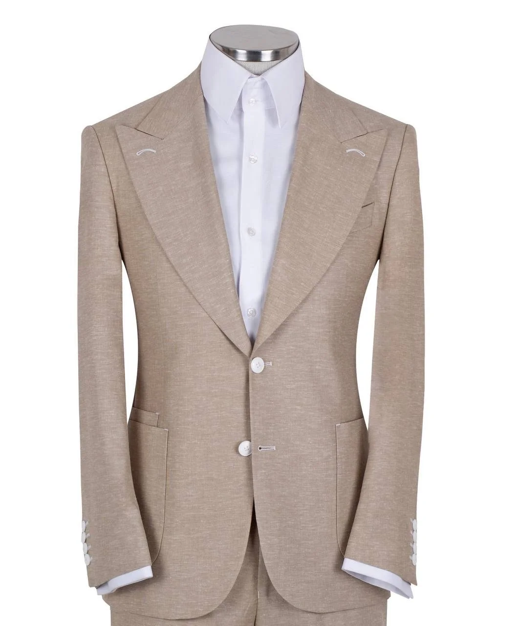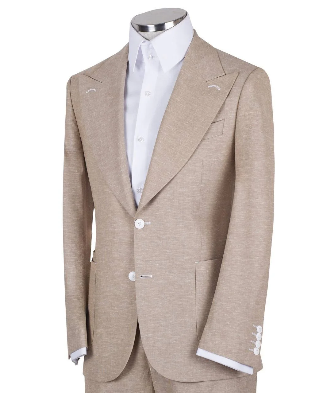 The warm beige hue delivers a clean, elevated look, while the premium linen fabric ensures breathability and comfort in any setting. Finished with a bold peak lapel and a structured slim fit, this piece offers a refined silhouette that speaks confidence without excess.
