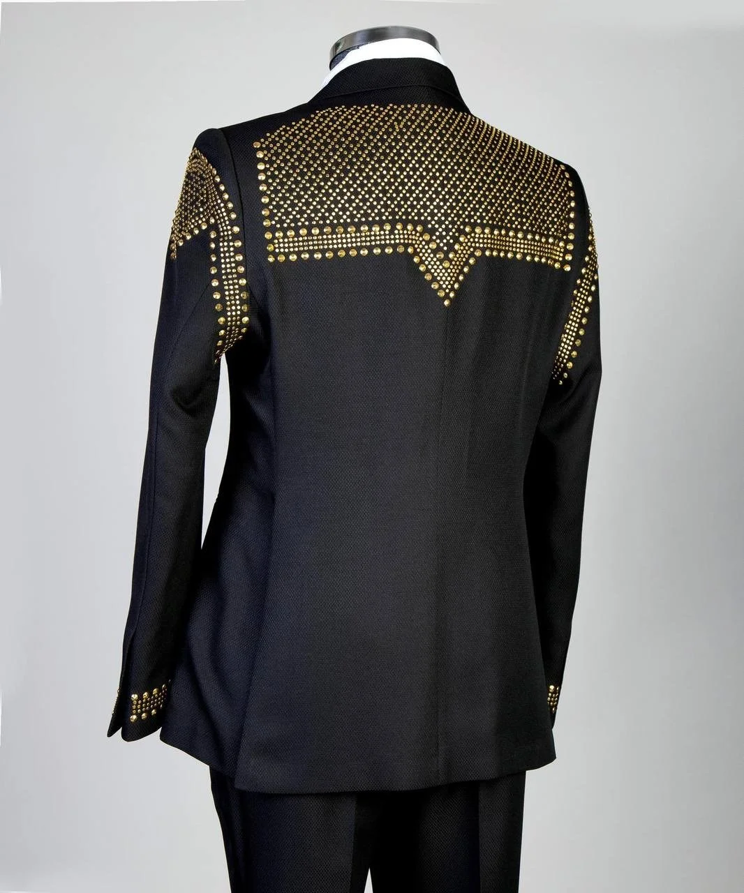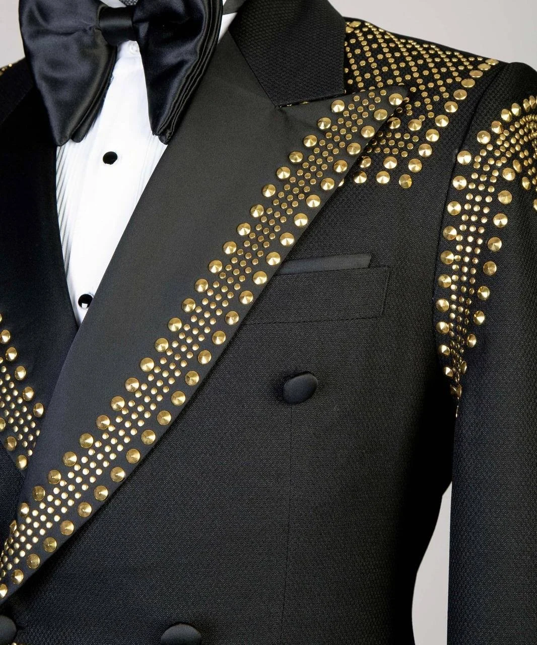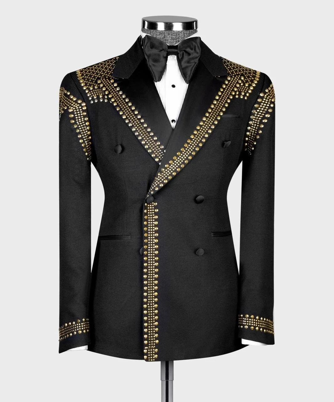 This double-breasted masterpiece is adorned with hand-applied gold studs that trace the shoulders, lapels, sleeves, and back — creating a powerful yet elegant visual impact. The sleek black satin peak lapel adds depth and contrast, while the structured slim fit enhances the physique of the modern gentleman.