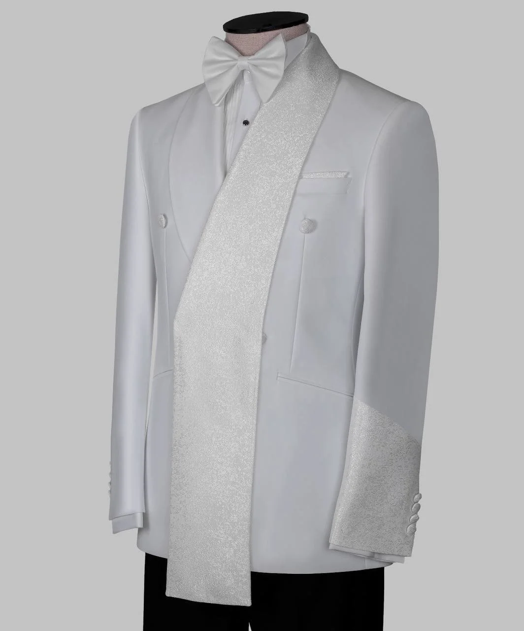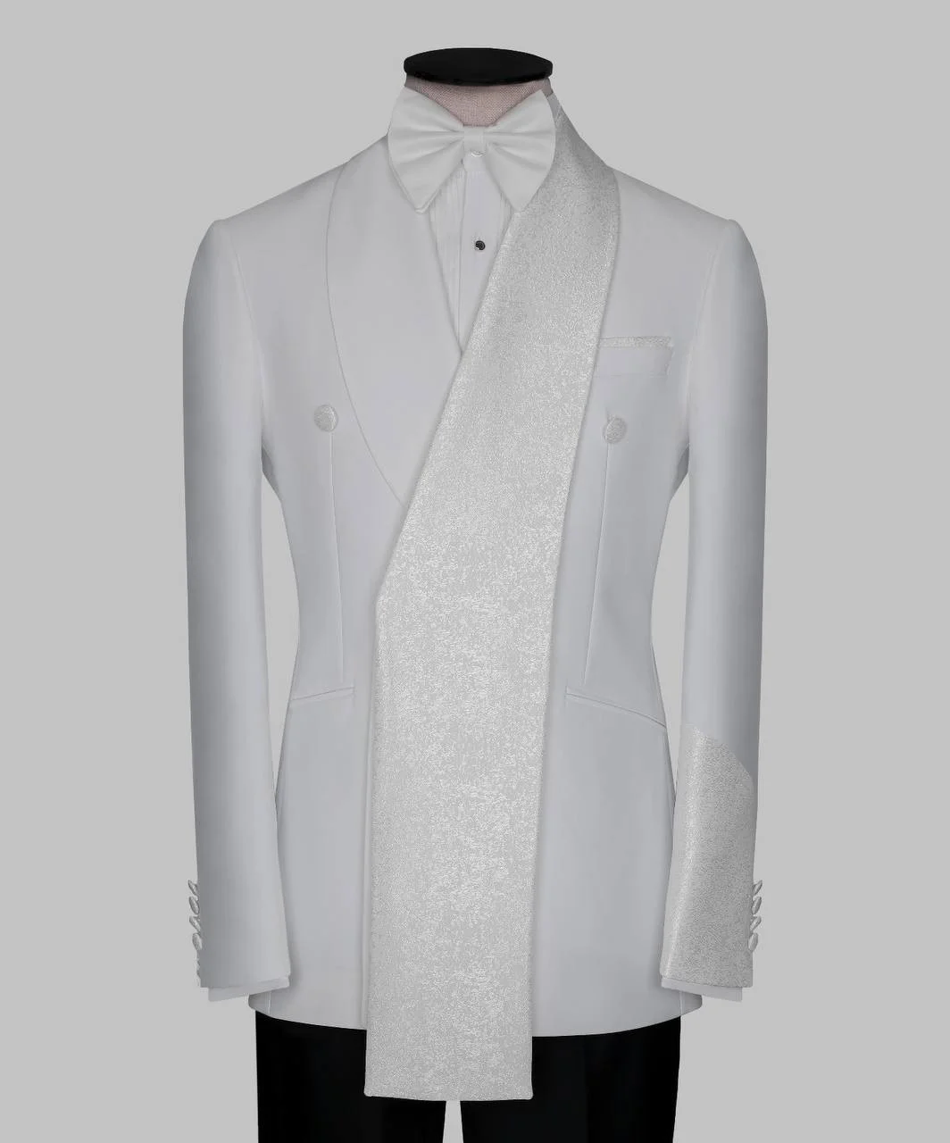 An iconic design that blends tradition with opulence, the Bronze Royale Tuxedo Set is a statement of modern luxury. Its obsidian-black foundation is elevated by a hand-applied bronze metallic brocade overlay, creating a bold yet refined look for distinguished occasions.