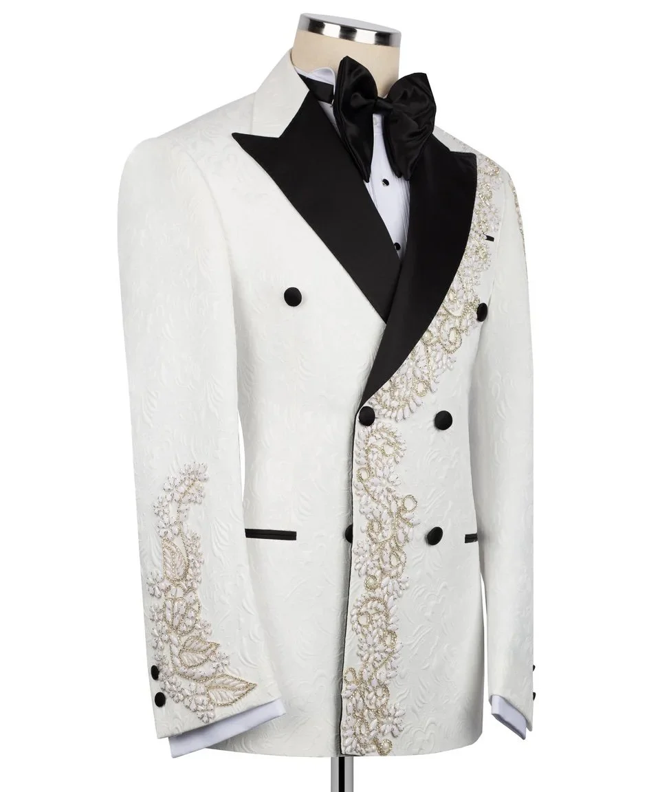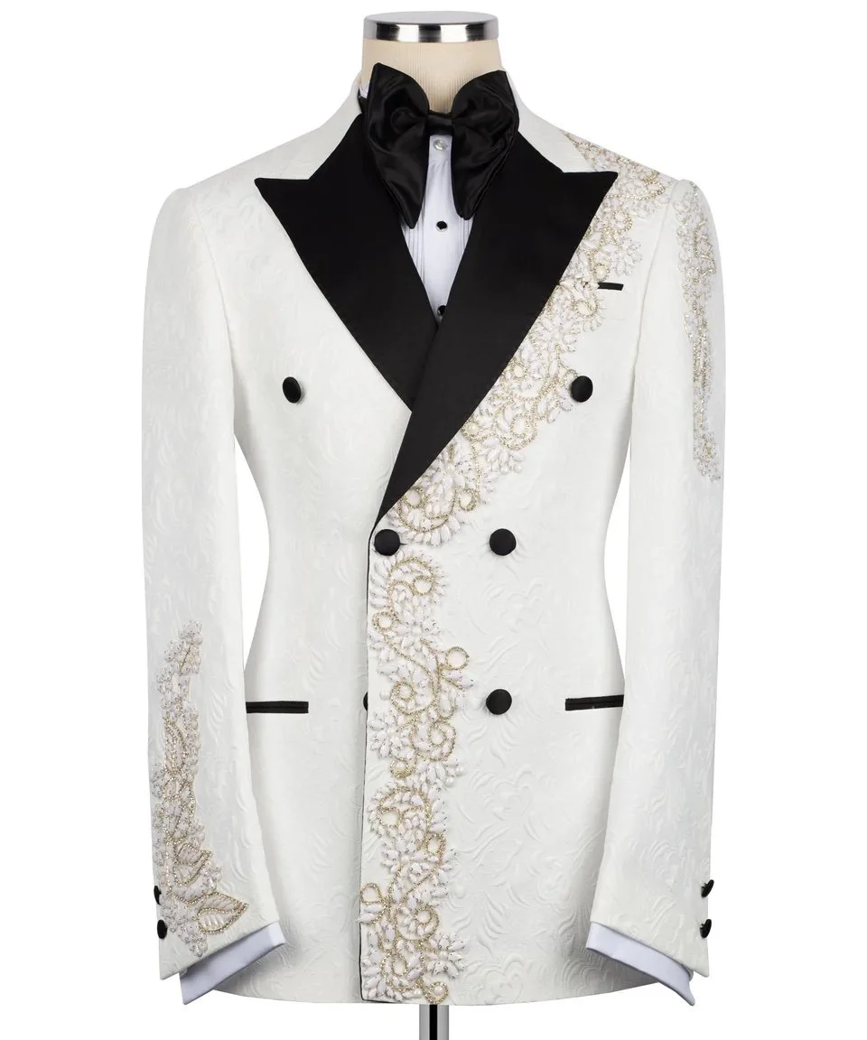 The Royal Monarch is crafted on a rich ivory jacquard base, elevated with intricate hand-applied gold embroidery cascading from the shoulder down the body and sleeves. The bold black satin peak lapel creates a powerful contrast, delivering a timeless yet commanding silhouette.