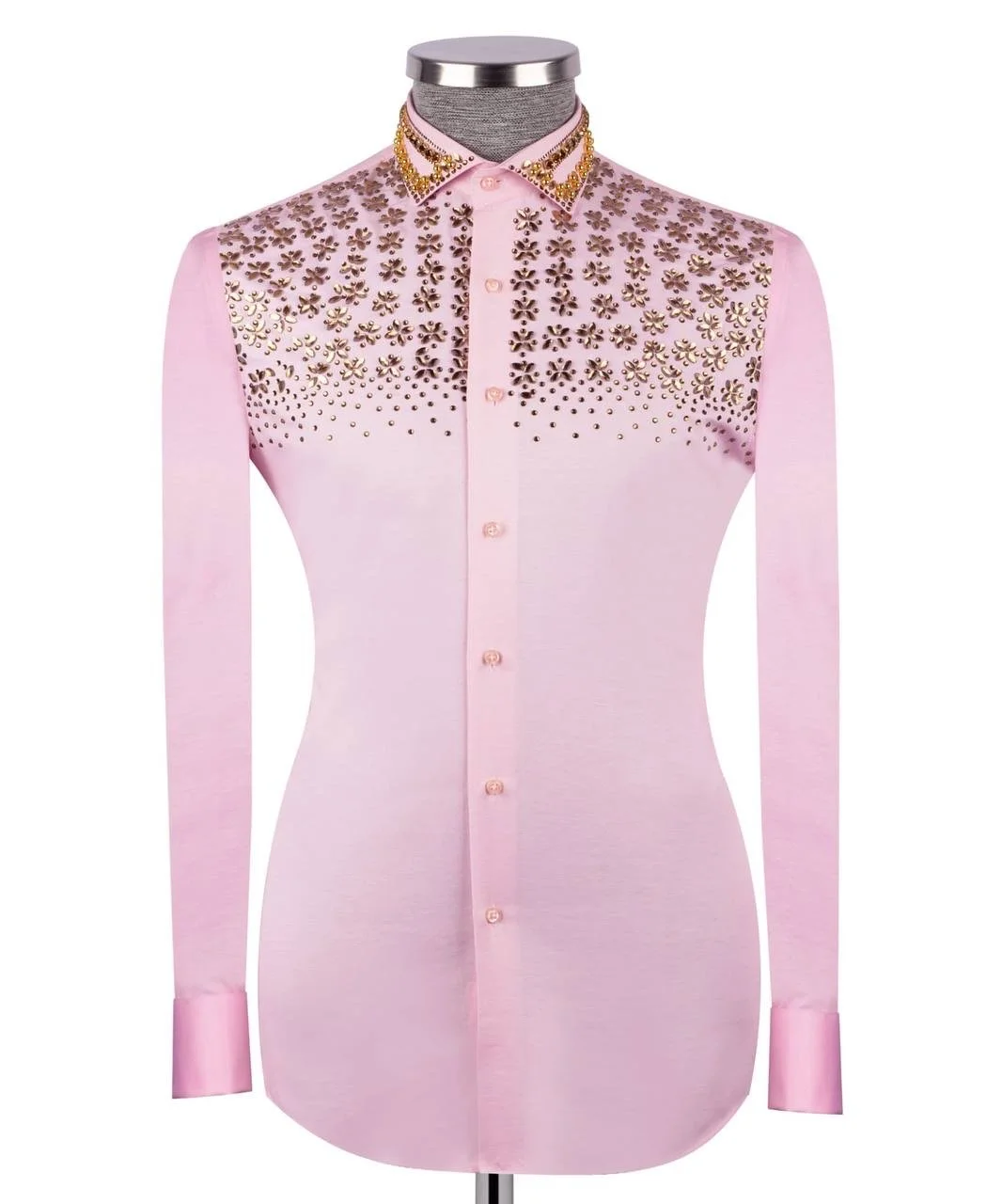 Elevate your presence with the Rosé Cascade Embellished Shirt, a masterful blend of modern elegance and expressive detail. Crafted from smooth blush-pink cotton satin, this shirt is adorned with intricate gold bead embellishments that gracefully cascade from the shoulders, adding an air of luxury and sophistication. Perfect for special occasions, red-carpet moments, or high-fashion evenings, it delivers a bold yet refined statement for the modern gentleman.